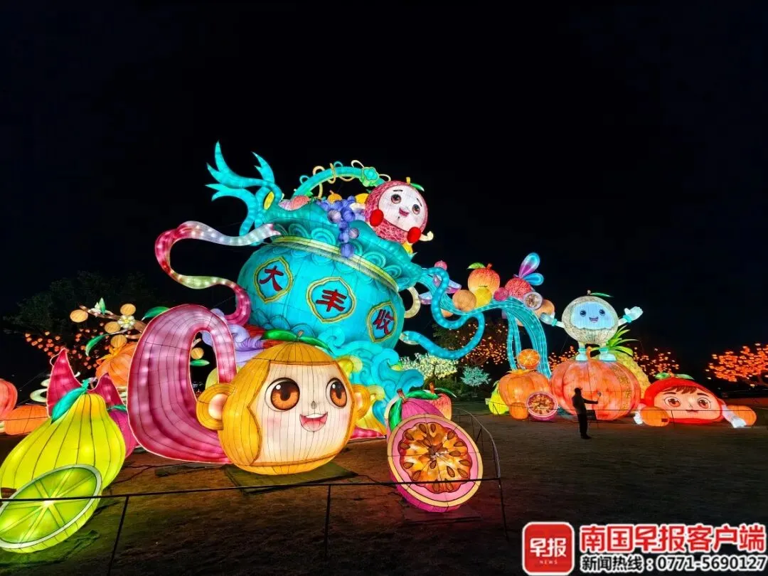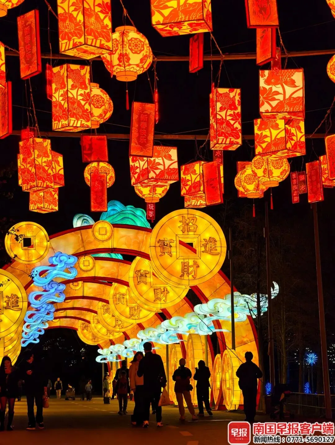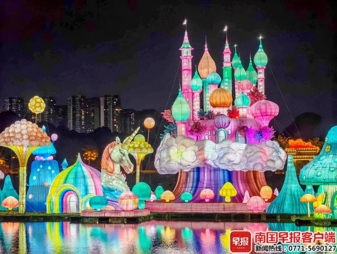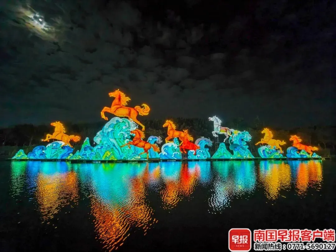 本届灯会规模大幅升级,总体占地面积扩展至约1430亩,以“高、大、新、奇、美”为特色,集“形、色、声、光、动”于一体,展出各种主题的水面灯组、陆地灯组、通道氛围灯组等共43组,包括承载祈福愿景的“财神大道”主题灯组,以巨龙动态造型搭配连续拱门、传递国泰民安祈愿的“龙腾盛世”通道氛围灯组,还有双凤华美造型融合壮乡绣球与鼓乐元素、尽显民族欢腾气韵的“双凤和鸣”灯组,以及寓意事业顺遂、旗开得胜的超大型水面灯组“光驰八骏”灯组,还有以蘑菇屋、独角兽打造奇幻童话氛围的“梦幻城堡”灯组以及满载鲜果、搭配梦幻植物与萌趣生灵、传递丰收富足寓意的“硕果累累”灯组,不同年龄段的游客都能在此找到心头好。