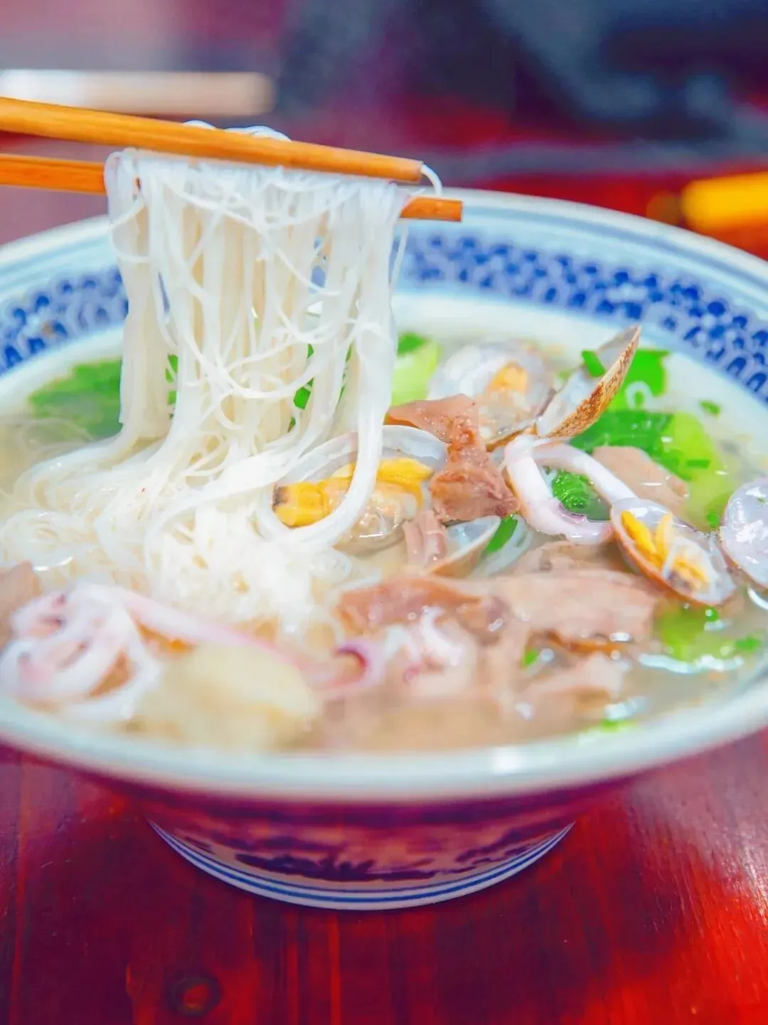这是福州最具代表性的早餐,是用磨好的米浆沿热锅边浇一圈烫成薄片,铲入蚬子或海鲜汤中,搭配着虾米、紫菜、香菇等,特点:汤鲜米皮滑嫩。