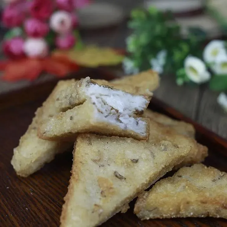 芋粿三角糕也叫三角粿,形状为三角形!是用槟榔芋蒸熟再压泥,混合着米粉、香菇丁、虾皮等蒸制,然后再切成适合大小的三角形,放入油锅煎、炸至外脆里糯,芋香浓郁,是福州传统点心。