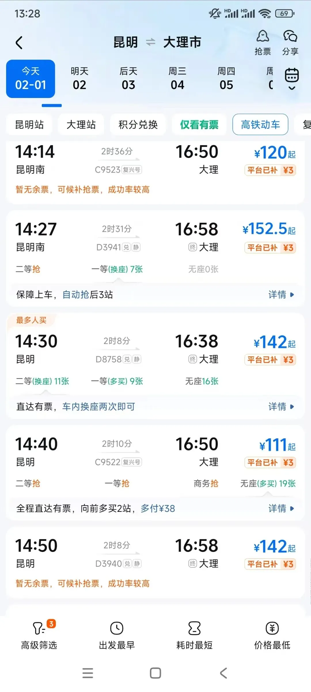 昆明过来高铁是2个小时,票价大概150