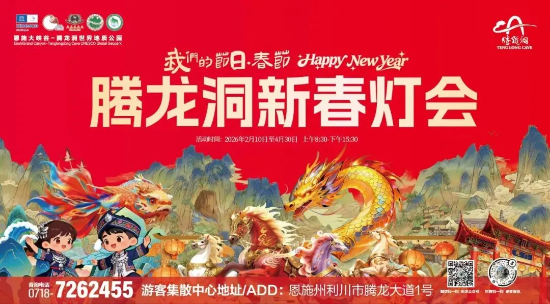出发时间:08:00-08:30游玩时长:08:30-12:00(3小时30分钟,含游览及观看演出时间)从利川市区出发,可乘坐6路公交到利川法院站,步行500米抵达腾龙洞游客中心;自驾导航“腾龙洞景交停车场”,全程约30分钟。游玩路线:腾龙洞入口喜楼迎宾NPC互动→卧龙吞江大瀑布→主洞口骏马踏春NPC快闪→佛到池鱼跃龙门龙王迎亲→沿途观看更多绝美花灯→龙鳞山巨龙腾飞→后洞自然景观→观看激光秀《腾龙飞天》→乘坐景交车返程至洞口300米处→观看大型土家族情景歌舞《夷水丽川》→索桥。