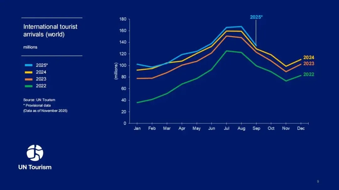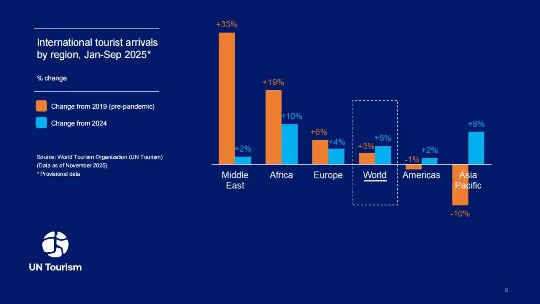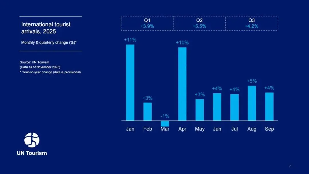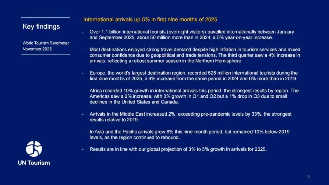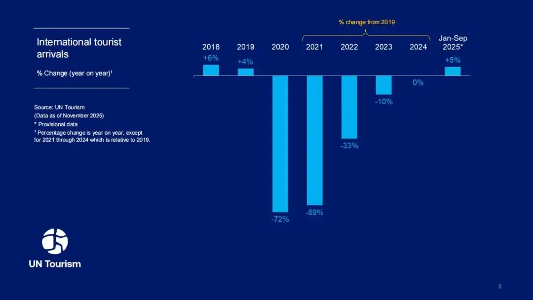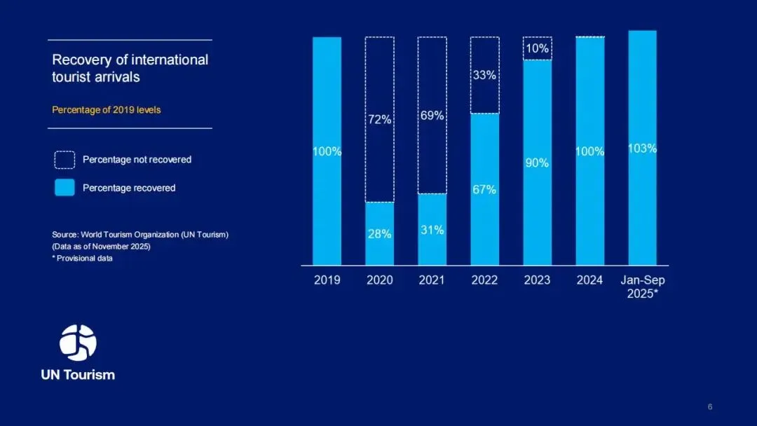 联合国世界旅游组织(UN Tourism)发布的2025年11月《世界旅游晴雨表》(第23卷第4期)显示,2025年全球国际旅游市场持续复苏,各项指标呈现稳步增长态势,尽管面临多重外部挑战,旅游需求依然保持强劲。