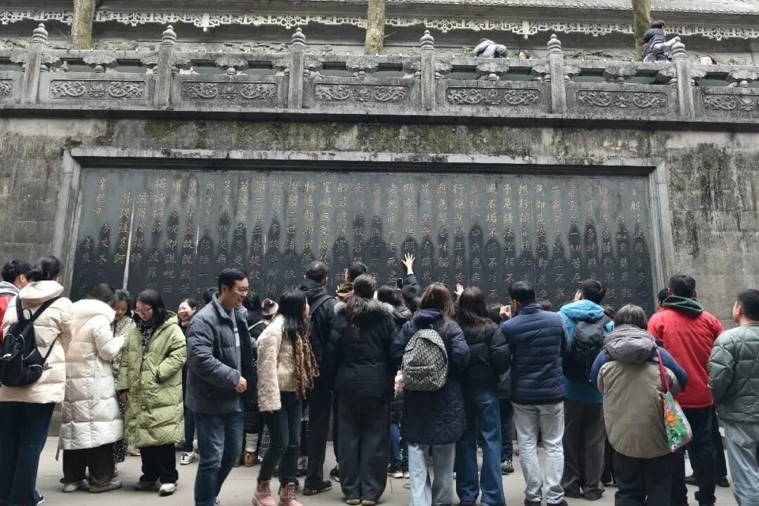 广场台阶上面是大雄宝殿,殿前好多游客顺时针绕着铁香炉走,边走边摸,估计想沾点福气。宝殿正面是如来佛像,背面是观音菩萨像,好多人在这儿祈福。出了大雄宝殿往上走是药师殿,殿后墙上刻着《般若波罗蜜多心经》,一堆人挤着摸字祈福,我挤不进去,干脆放弃继续往上走。