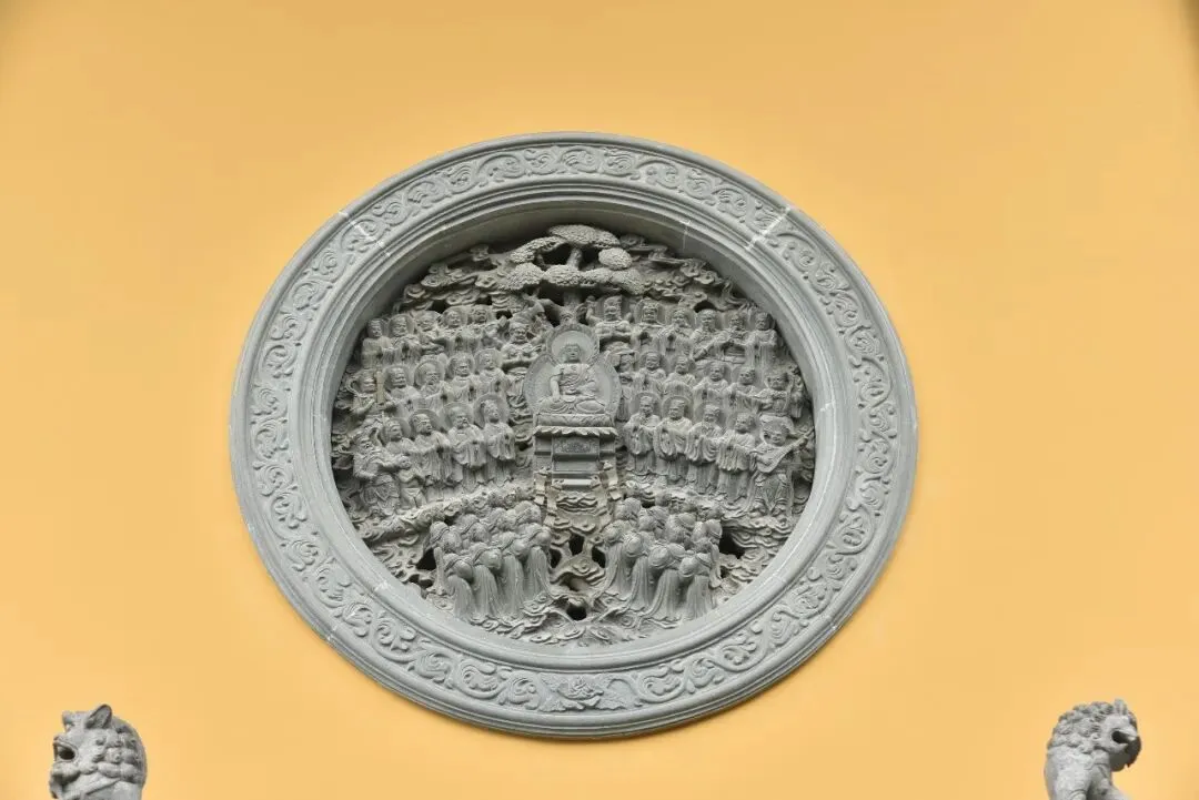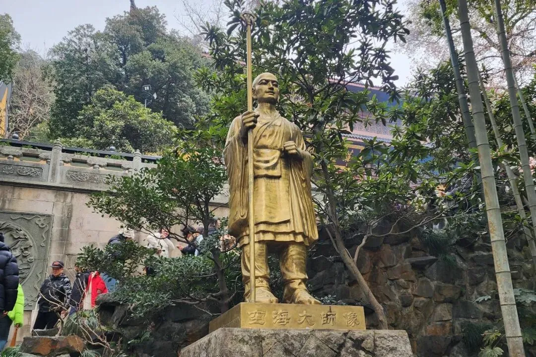 从左边阶梯上去到了藏经阁,可惜围起来进不去。藏经阁后面的山坡上刻着红底的 “庄严国土” 四个大字,特别显眼。这里只能从左边上山,右边阶梯在维修封了。半坡上有个铜雕像,我说像唐三藏,爱人说像鉴真和尚,走近看底座才知道是空海大师像,俩人都猜错了。阶梯边的树上开着一簇簇黄白色的小花,爱人说这树看着像枇杷树,原来枇杷花长这样。再往上走就到了灵隐寺的最高处:华严殿,这里面供着如来像,两边是文殊和普贤像。殿前栏杆上的石狮、殿墙窗户上的佛像雕刻都特精致,栩栩如生,我对着这石狮和窗雕拍了好多照片。