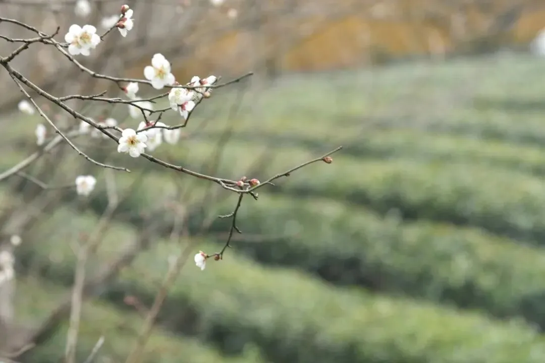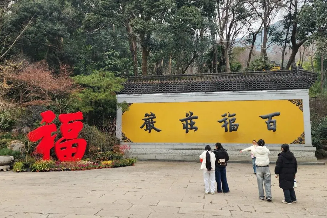 进永福寺大门就是个广场,迎面是一面黄照壁,上面写着 “百福庄严”,我还特意确认了下认没认错。照壁左边立着个超大的红福字,格外醒目。永福寺并未循传统寺庙的中轴线布局,而是依山而建,游人可穿行于溪水之侧、茶园之中,移步换景,意趣盎然。溪水边、山坡上几株白梅开得正艳,让人忍不住停下拍照。路边的狸花猫、奶牛猫胖乎乎的,一点不怕人,镜头感比我家雪球好太多,对着镜头一点不躲,好多游人围着它们拍照。山路边还立有块牌子,写着 “山不转路转,境不转心转”,字句应景,又合此刻心境。