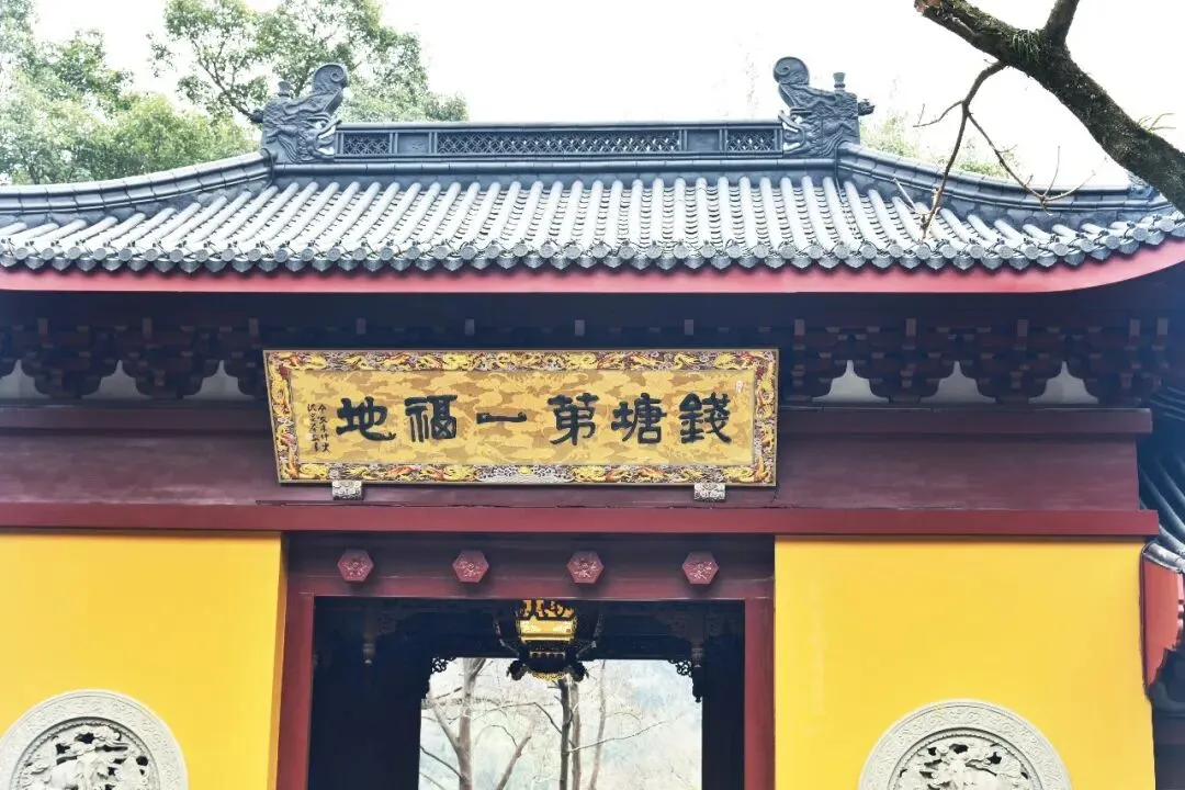 吃完面走到永福寺正门,看见门背面的牌匾写着 “钱塘第一福地”,果然名不虚传。我指着门里上方挂的精致大灯笼跟爱人说:“你看这灯笼下面也有福字,不抬头看根本发现不了。”