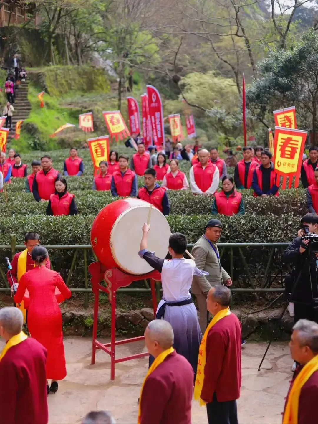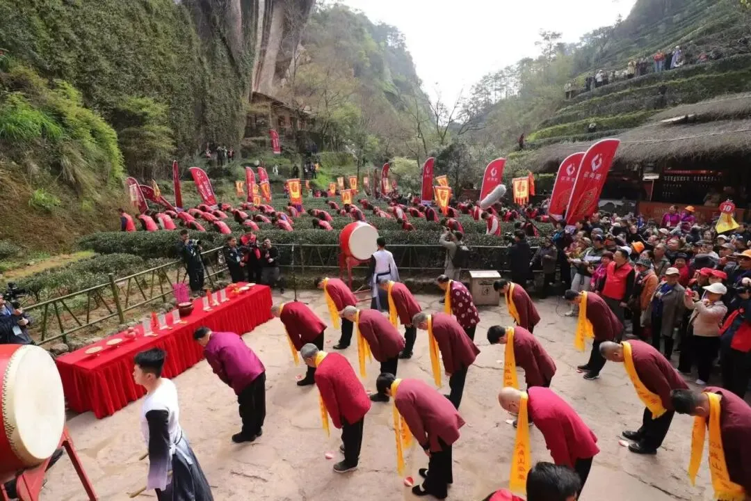 随之而来的喊山声,唤醒了入冬以来沉睡已久的茶叶。每年惊蛰时节,茶农们便齐聚九龙窠大红袍茶园,摆设祭台,以虔诚之心向茶神敬献供品与香烛。在悠扬的鼓声中,他们齐声高呼“茶发芽!茶发芽!”,一声声悠长而嘹亮的呼喊,回荡在山谷之间。这是茶农们对大自然的呼唤,也是对茶神最真挚的祈愿。