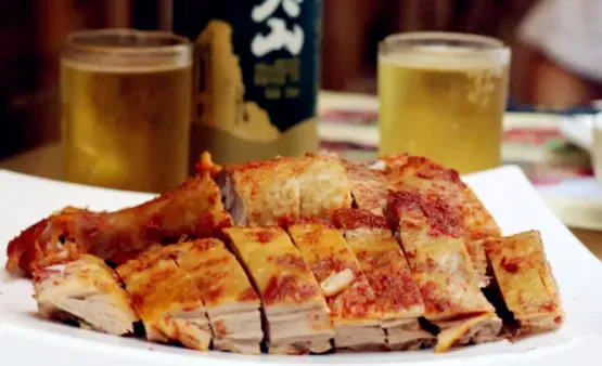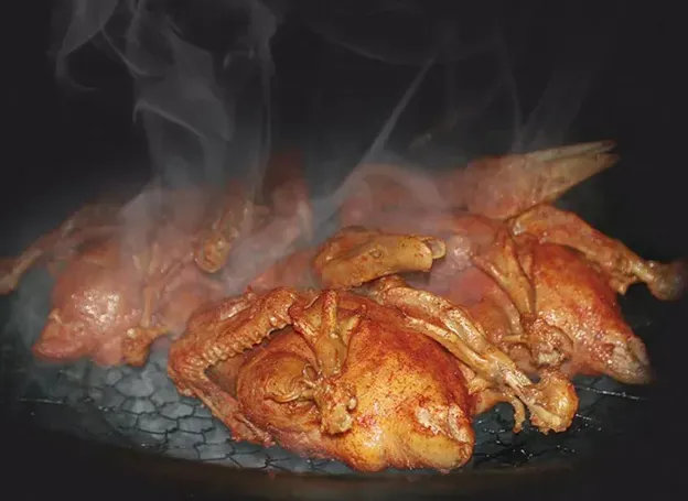 武夷山的传统美味之一,好吃到口齿留香。先将鹅肉煮熟,然后再涂抹上辣椒、白盐、味精、上等油,将涂抹好了的熏鹅架于底下放着糯米的锅中,用柴火烧制。