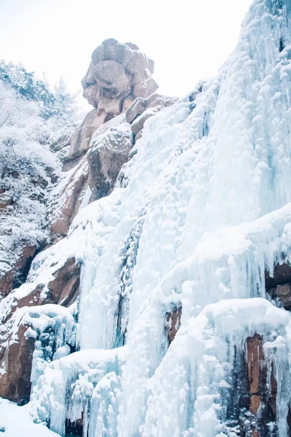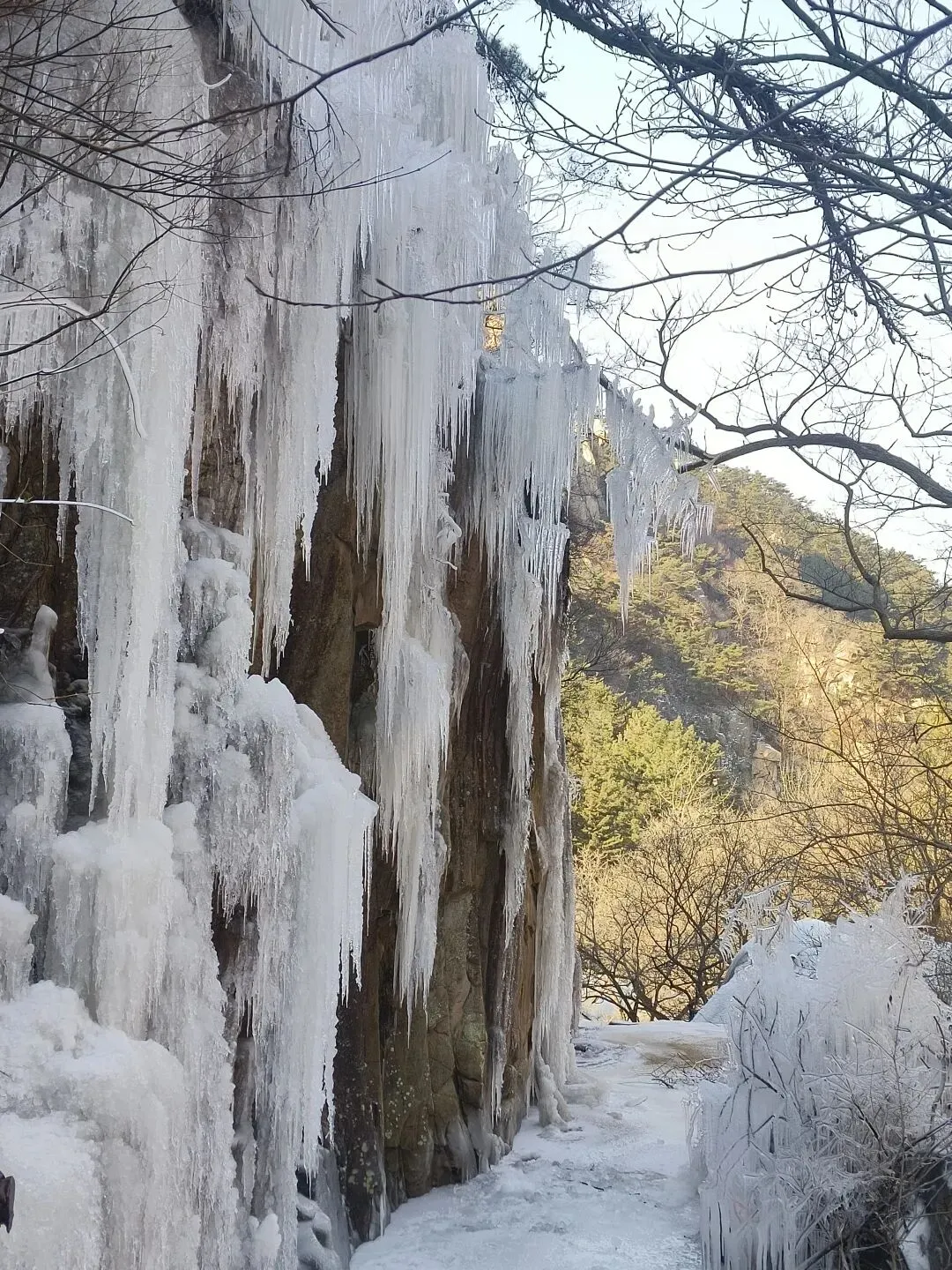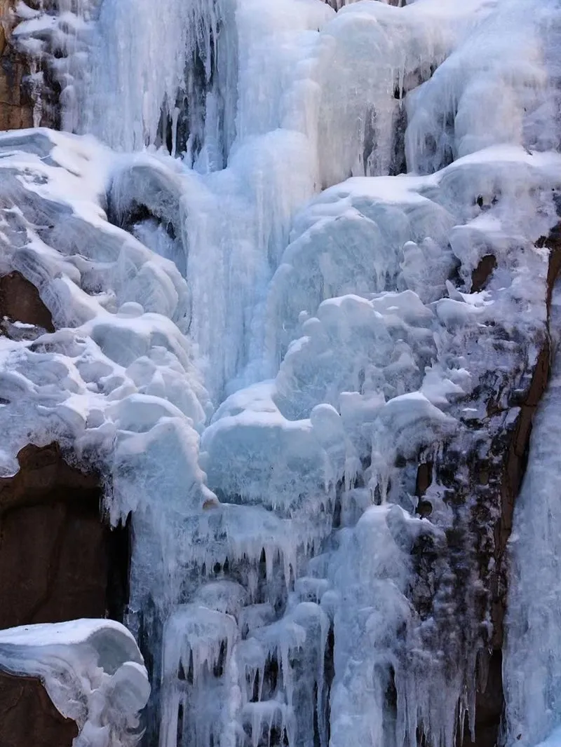 冷翠峡:当之无愧的C位!巨型冰瀑从高空垂落,层层叠叠的冰柱如水晶帘幕悬挂崖壁,阳光照射下泛着清冷的蓝光。站在观景台仰拍,能将冰瀑的壮阔全景尽收眼底,与冰瀑上方的“虎头”岩石同框,氛围感直接拉满!