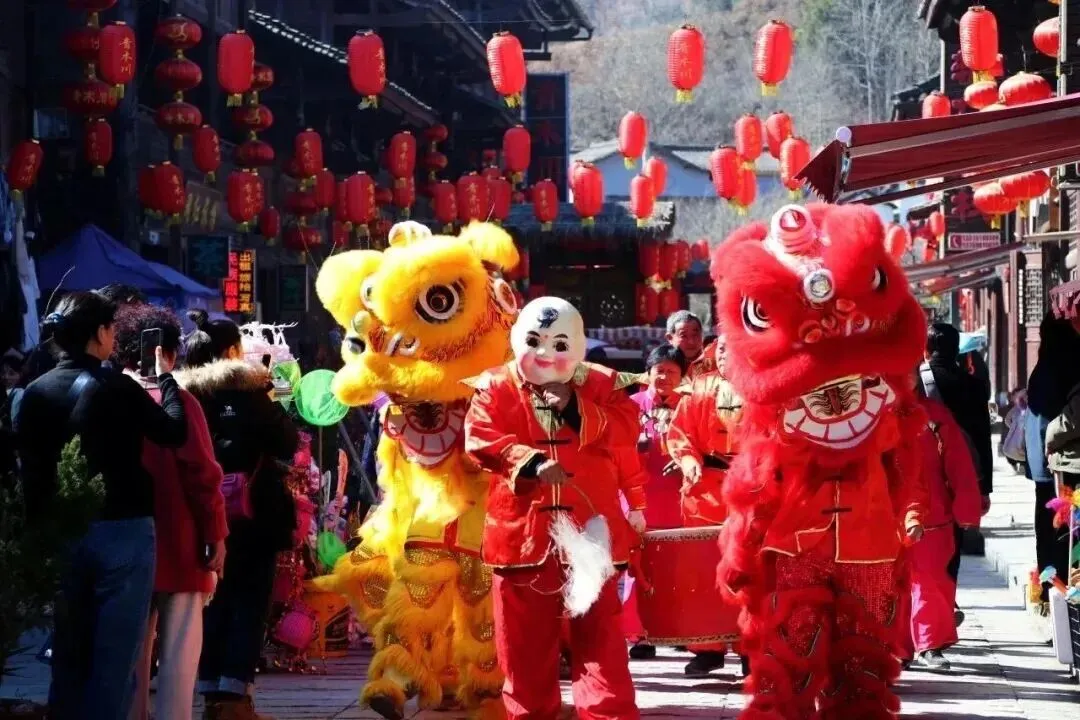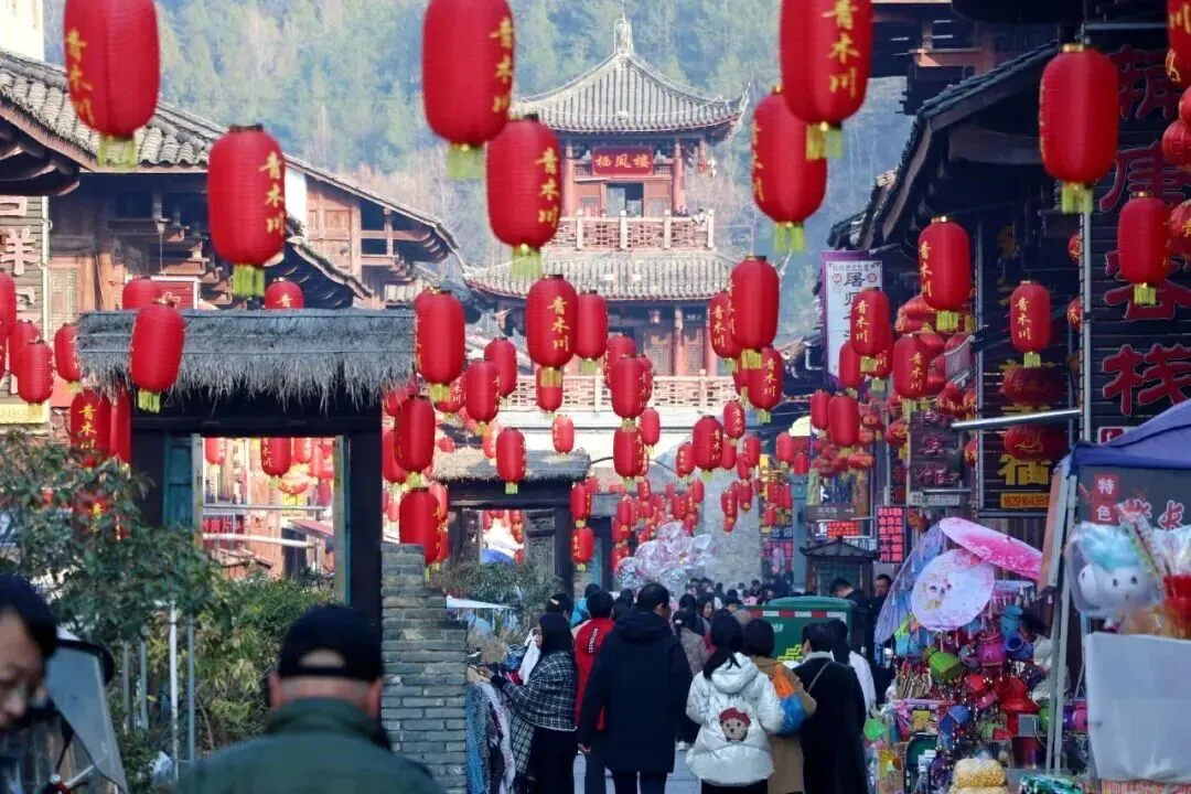 青木川古镇藏着陕南春节的烟火韵味,地处陕甘川三省交界,素有“鸡鸣三省”之誉。飞凤桥廊檐下红灯高挂,魏氏宅院等老建筑贴上福字。老街两旁,售卖山货、手作的小摊与地道餐馆热气蒸腾。春节期间还有羌族傩戏、羌歌羌舞、《魏老爷巡街》实景展演等特色活动,沉浸式感受羌汉民俗风情。