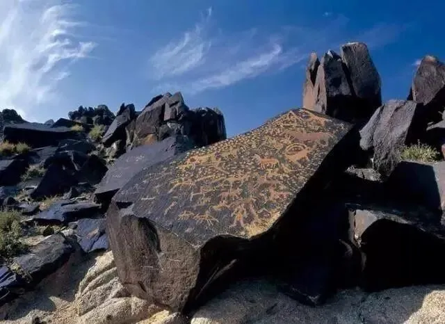 千年岩画,是先民们留下的生活印记。进入曼德拉山岩画区,沿着步道向前,可看到山脊、沟谷旁布满黑色玄武岩石,起伏蜿蜒如长龙巨蟒,其间分布着形态各异的嶙峋怪石。在光滑的玄武岩石上,刻画着羊、马等动物,从山顶俯瞰山下草原和大漠,甚是奇伟壮阔。