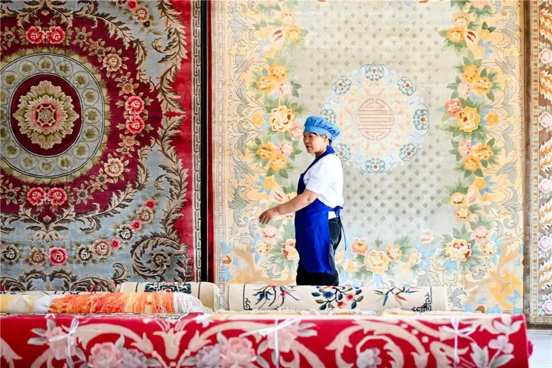走进工坊,看经纬交织间,一块块精美地毯慢慢成形。阿拉善地毯织造技艺历经岁月传承,以精细独特的做工和醇朴秀美的图案著称,每一块地毯都凝聚着匠人的心血。