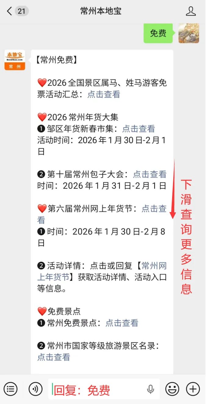 点击识别下方二维码,关注【常州本地宝】,点击发消息,在聊天对话框发送“免费”,即可获取2026常州免费活动(持续更新)、常州免费景点、免费公园、常州市国家等级旅游景区名录等信息。