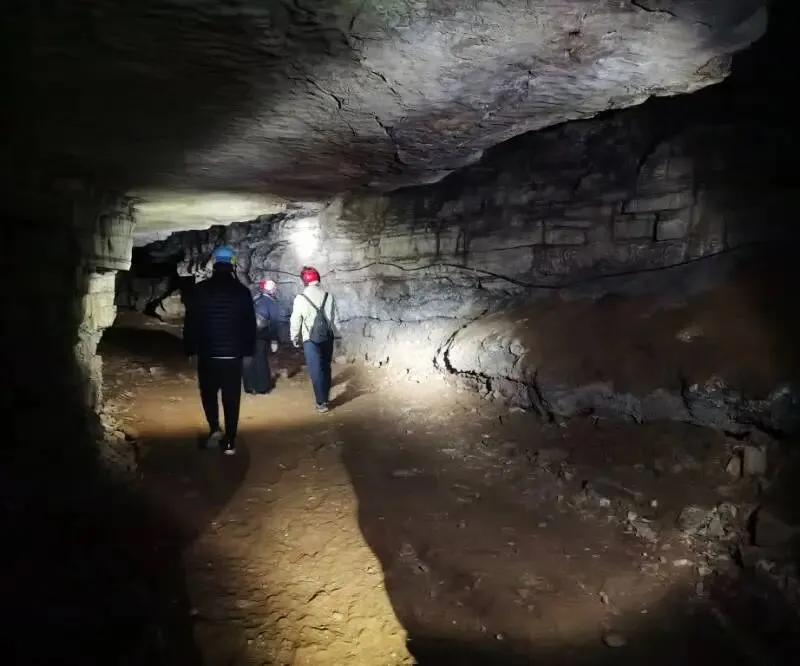 头灯的光束划破黑暗,照亮了千姿百态的钟乳石与石笋,“地心之眼”似穹顶悬月。