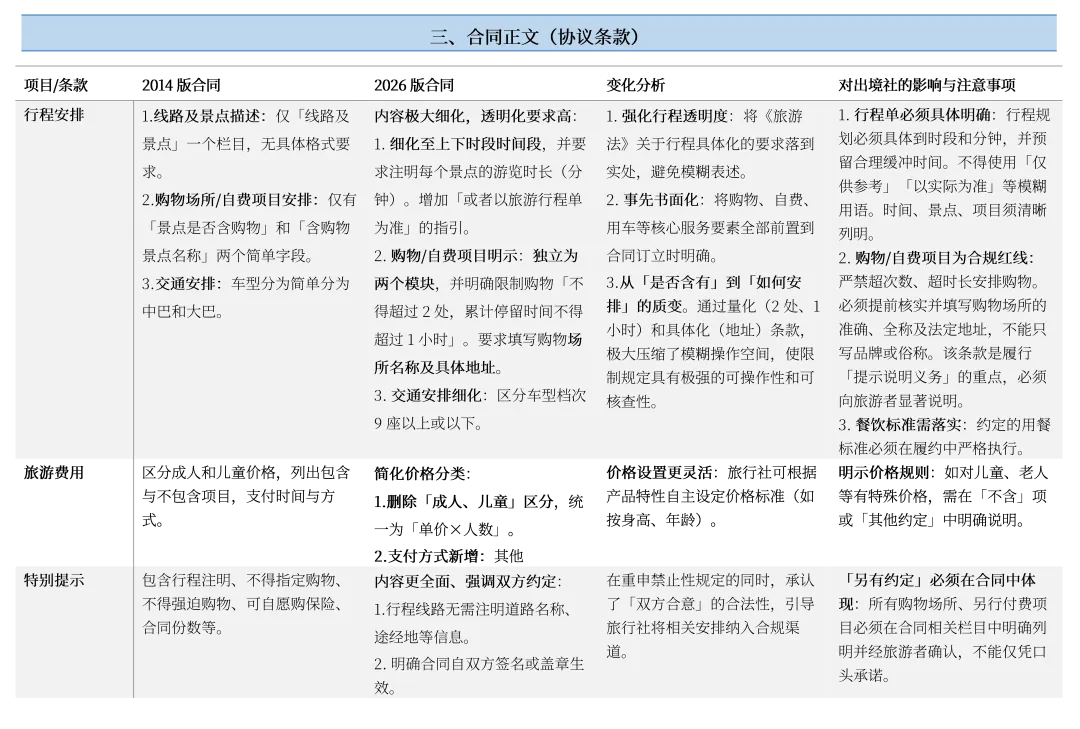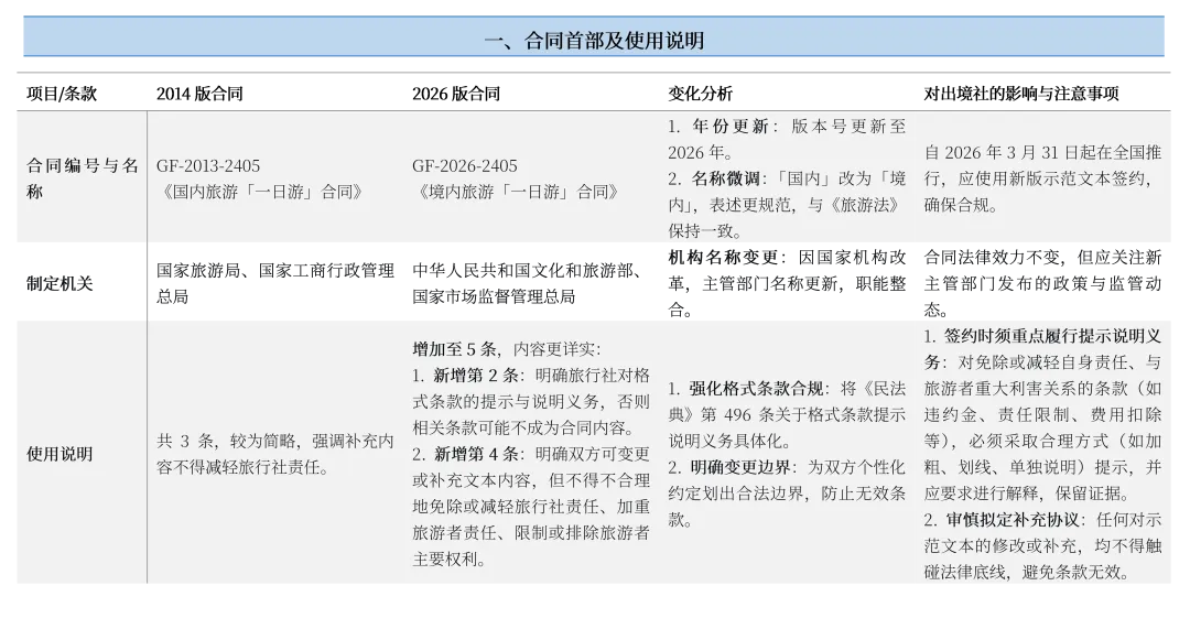 本文是我们对《境内旅游“一日游”合同(示范文本)》(GF-2026-2405),与2013年版(GF-2013-2405)进行的逐条对比,希望能对旅行社社朋友有所帮助。