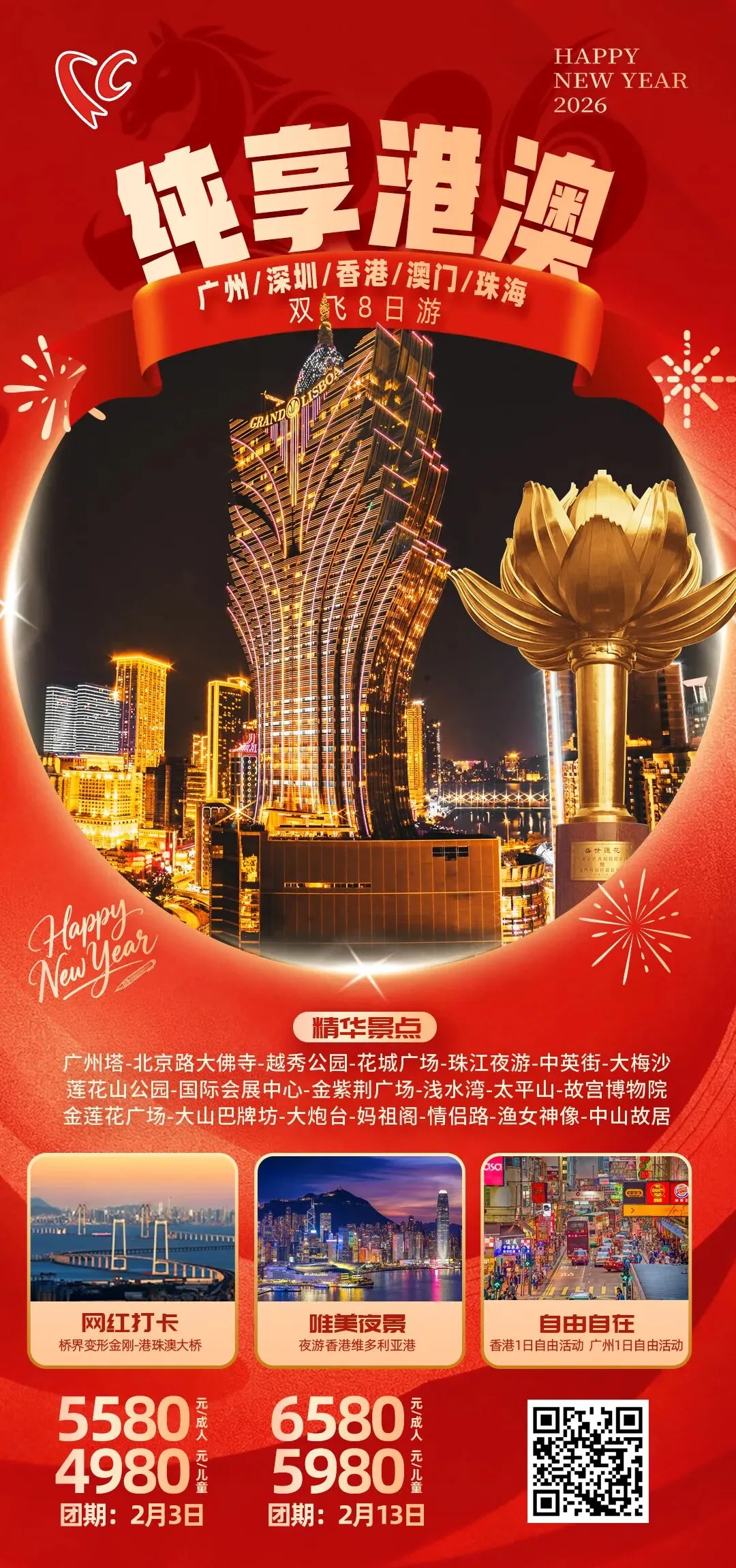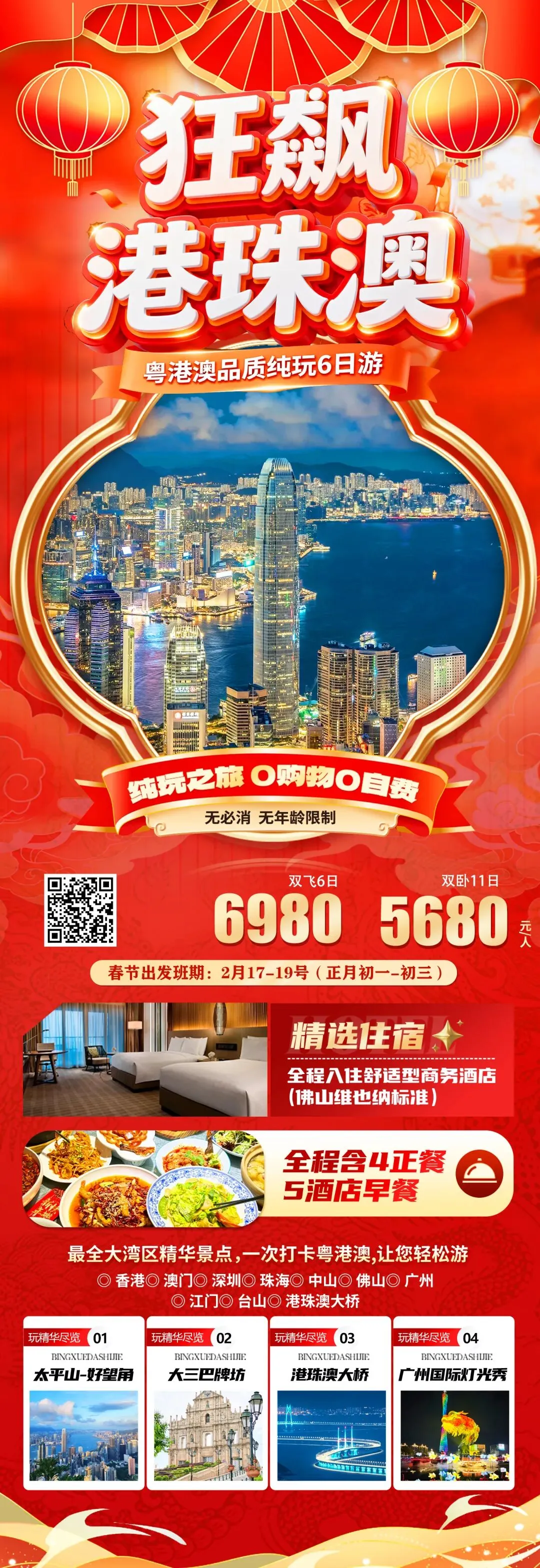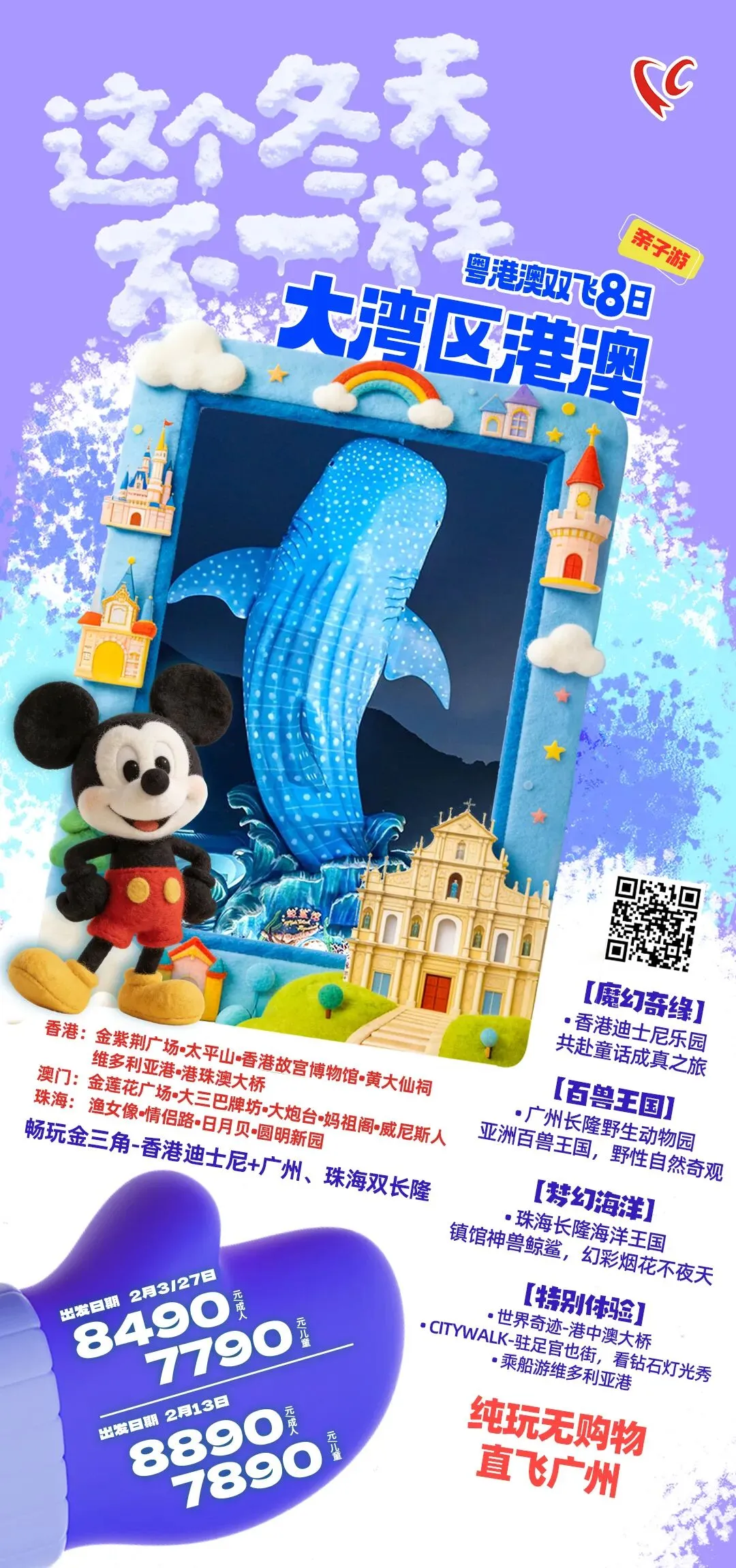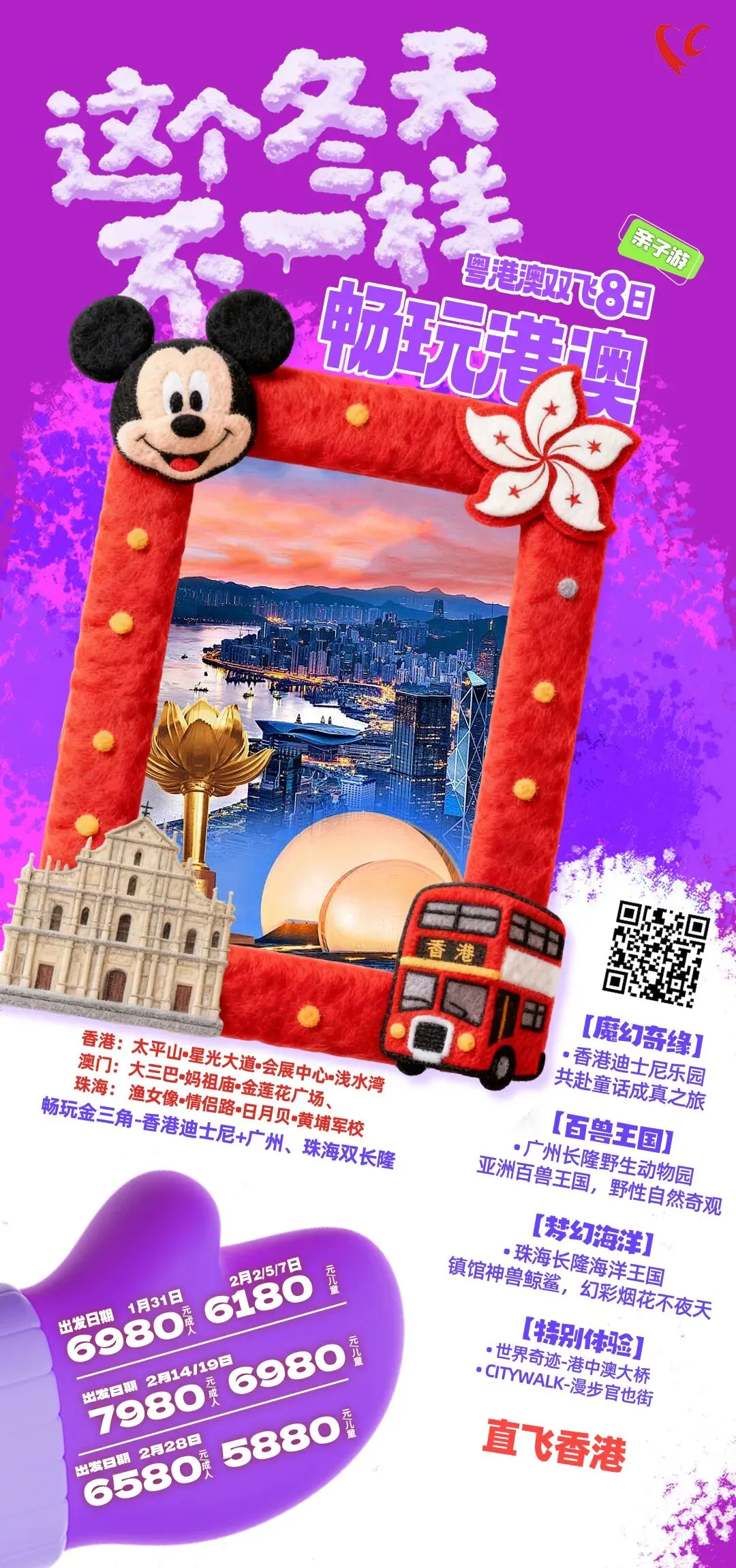 🍭2026这个寒假去大湾区港澳过不一样的冬天! ✈2月2日 首班6980元! 🎐经典景点:香港:太平山、星光大道、会展中心、浅水湾 🎀澳门:大三巴、妈祖庙、金莲花广场、 🎁珠海: 渔女像、情侣路、日月贝、黄埔军校 💌畅玩狂欢金三角: 🎡【香港迪士尼乐园】 🎢“全球独有魔雪奇缘,共赴童话成真之旅” 🦌【广州长隆野生动物园】 🐻“亚洲百兽王国,野性自然奇观” 🐬【珠海长隆海洋王国】 🐳“镇馆神兽鲸鲨,幻彩烟花不夜天” 🗼世界奇迹-港中澳大桥 🎺CITYWALK-漫步官也街 🌆夜游维多利亚港感受香港的霓灯初上 ♥纯玩无购物