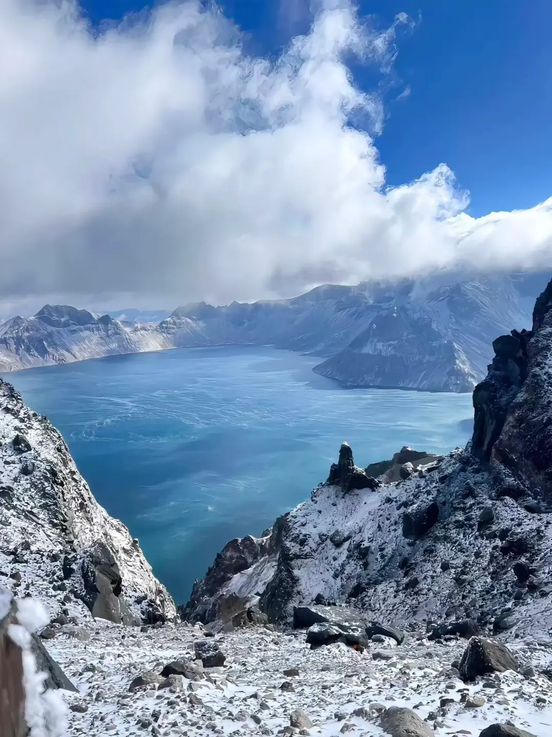 天池在博格达峰北坡,海拔不算吓人,湖在冰川脚下,水清得发蓝。