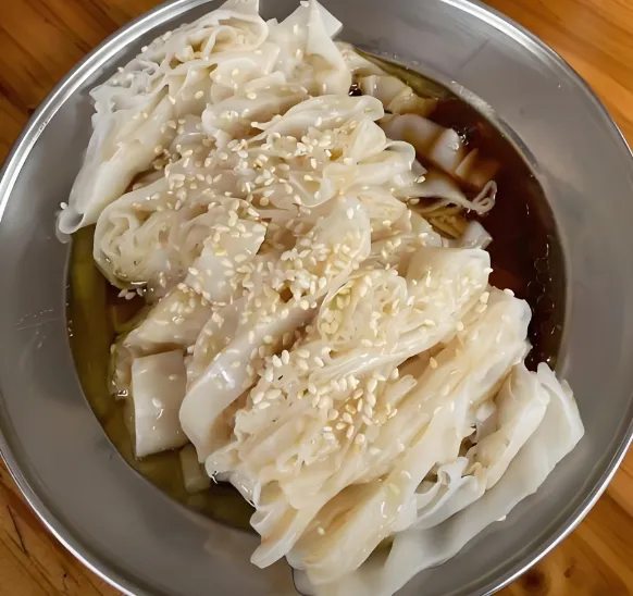 第三美食:茂名簸箕炊这是用簸箕蒸出来的米浆,层层叠叠,像千层糕。切成小块,淋上芝麻酱和香油,入口滑嫩,满口米香。这是路边摊的王者,几块钱就能买到的快乐,一定要尝尝。