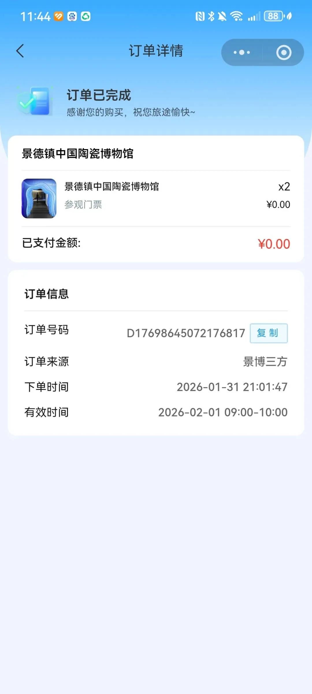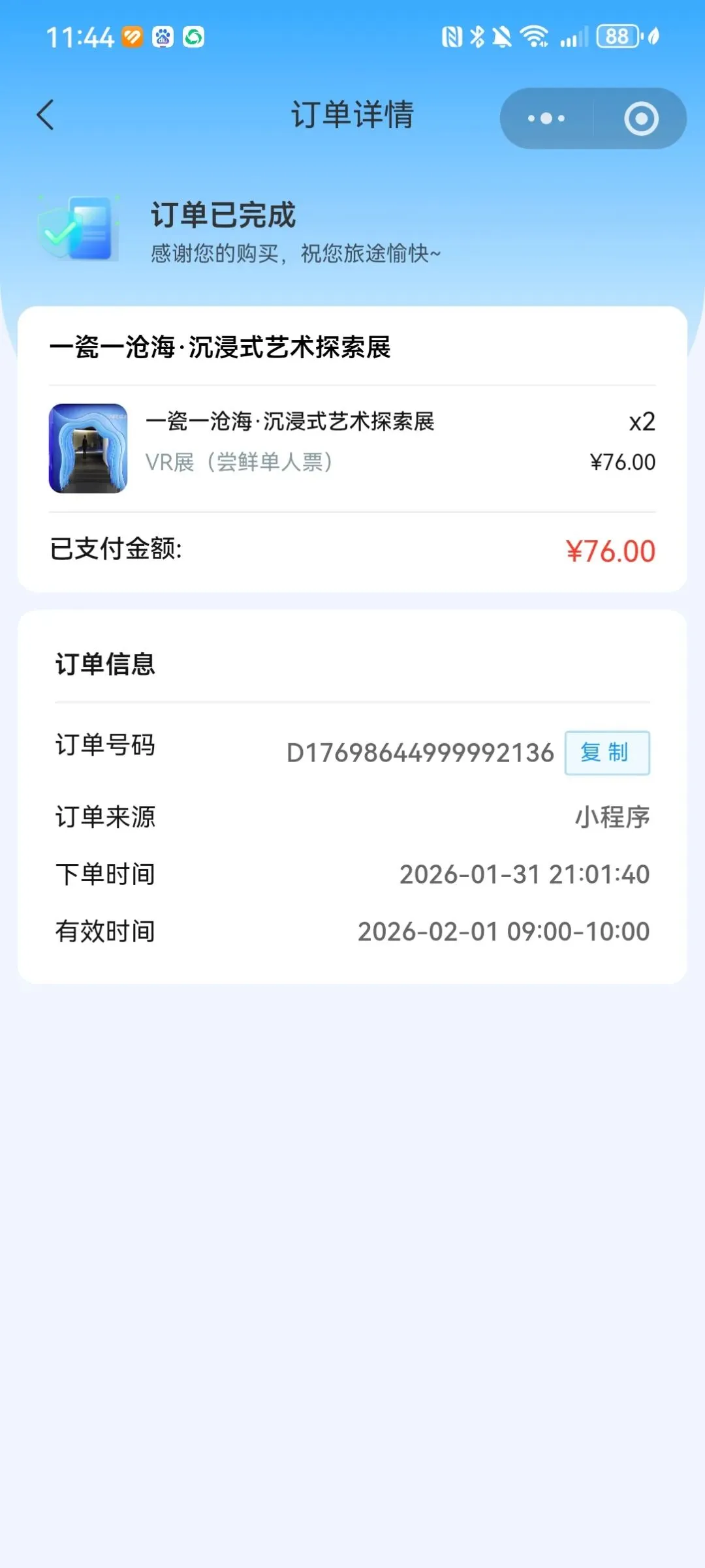 前天晚上预约时候,已经没票了,发现有VR项目,咨询了客服买这个票,也可以进展馆。订了两张,一张38,系统直接发过来了中国陶瓷博物馆馆的电子门票+两张VR门票。没约到票的,现场窗口还可以排队领申请电子票,这点比较人性化。但还是觉得买VR这个更简单,更好操作。