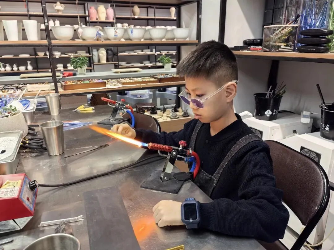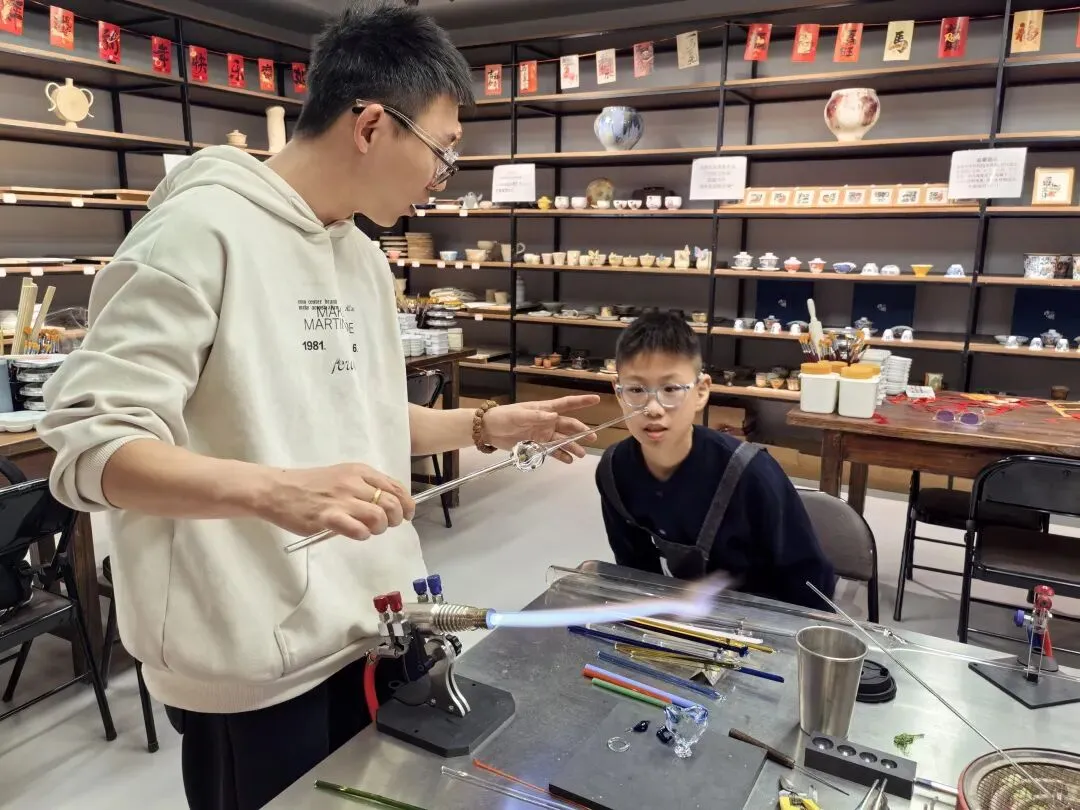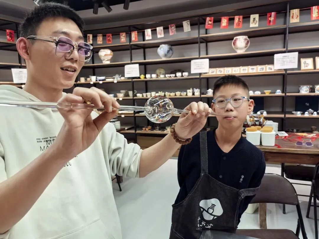 吃完饭,穿过马路,稍微休息了一会儿,两点半坐公交到陶阳里景区。门票大人53,儿童26元,三天有效期,无限次出入景区。我们刚走到网红打卡地,拍那个有裂缝的瓷器瓶的地方,小朋友说要先去体验做玻璃。无奈又折返,出了景区,去寻找那家言予窑陶艺店,体验感非常好,力荐+3。其实出来旅游,花了2个小时做手工,似乎有点浪费,但还是觉得超值。你会发现人是天生爱学习爱提问,尤其是对他未知的、感兴趣的领域。做手工有它特有的治愈作用,会给小朋友满满的成就感。