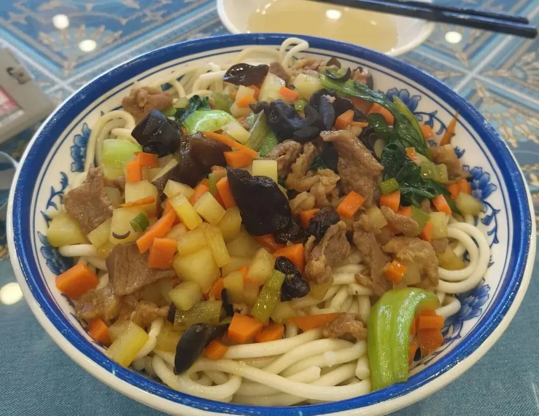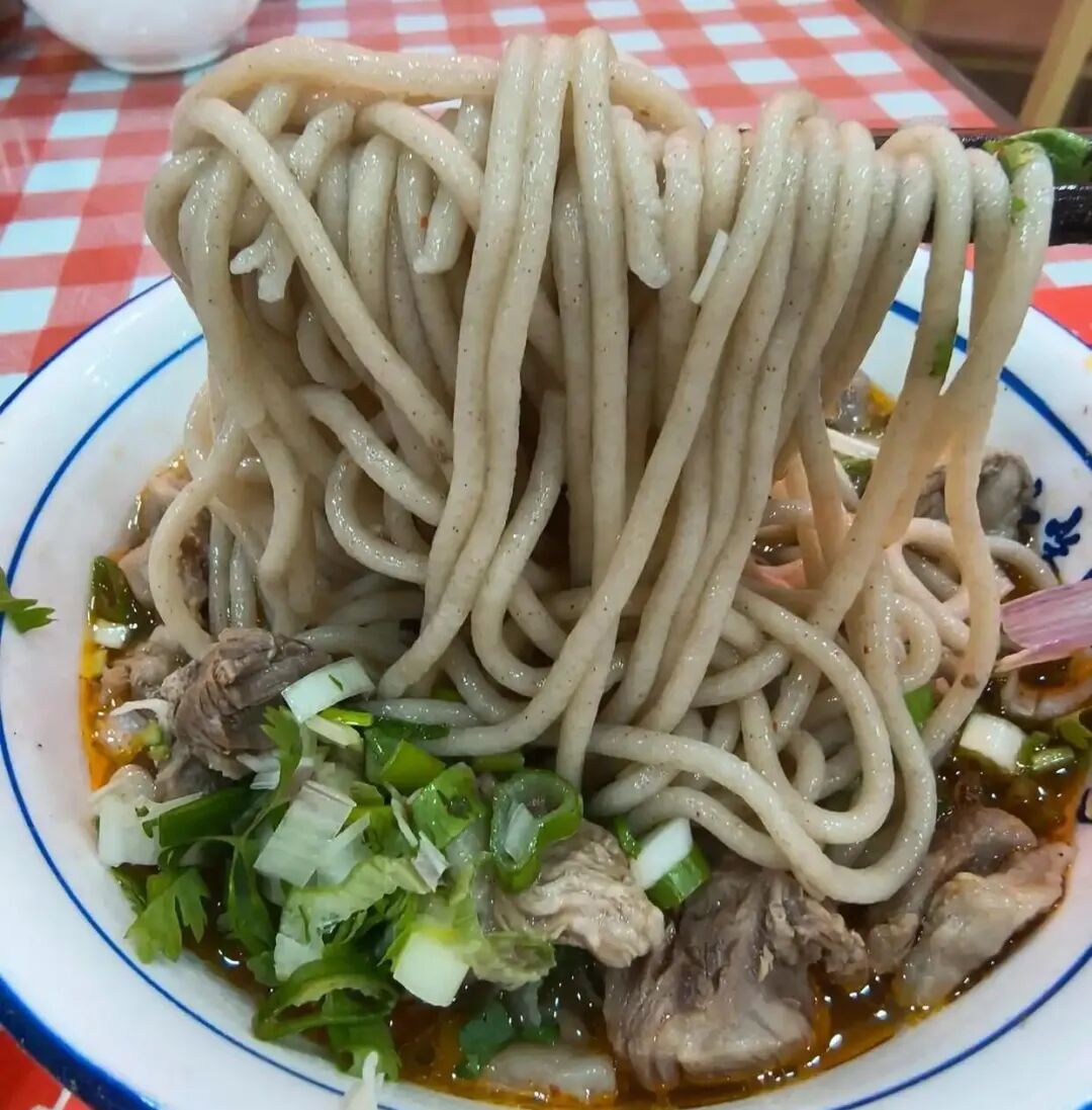宁夏传统面食,面条硬擀细切,筋道耐嚼;臊子以羊肉、青萝卜、辣椒、蒜苗等慢炒而成,汤多面少,酸辣鲜香。相传源于唐代“长寿面”,如今是银川街头巷尾的日常美味,营养丰富,老少皆宜。