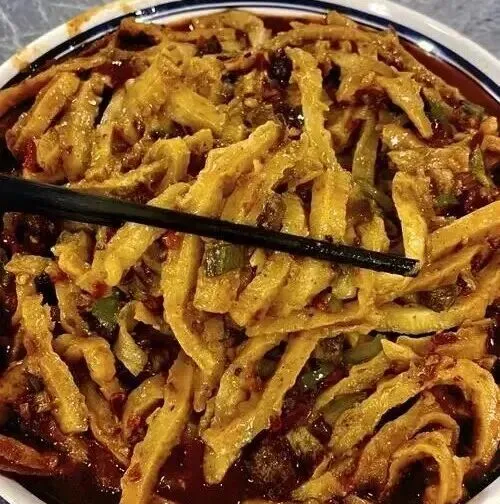 即炒饼,将烙好的薄饼切条,与肉丝、青椒、洋葱等快炒而成。口感香辣有嚼劲,配料丰富,制作快捷。流行于银川、吴忠等地,是一道饱腹又下饭的西北家常主食,深得百姓餐桌青睐。
