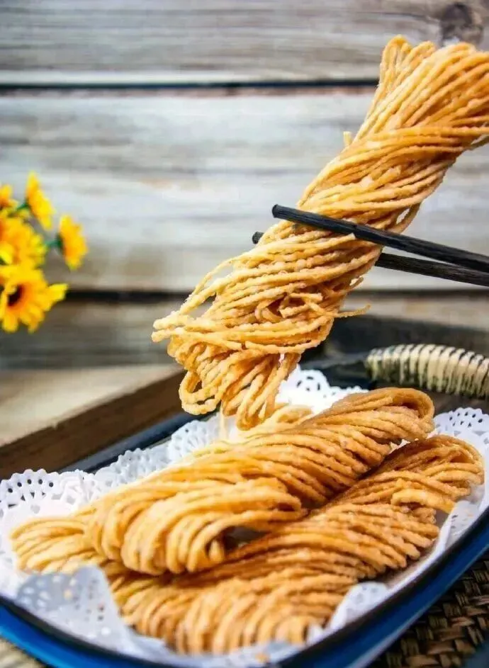 回族传统油炸面点,以面粉加鸡蛋、蜂蜜、红糖水揉制,搓成环状细条炸至金黄酥脆。节庆必备,形如金丝盘绕,香甜松脆。既是茶点,也可佐餐,在银川的早市或清真铺中随处可见。