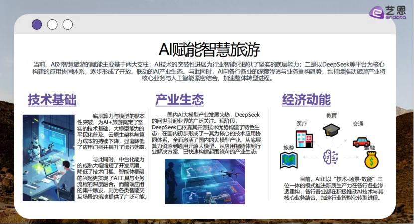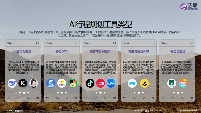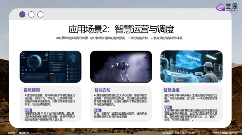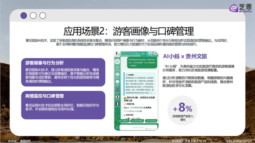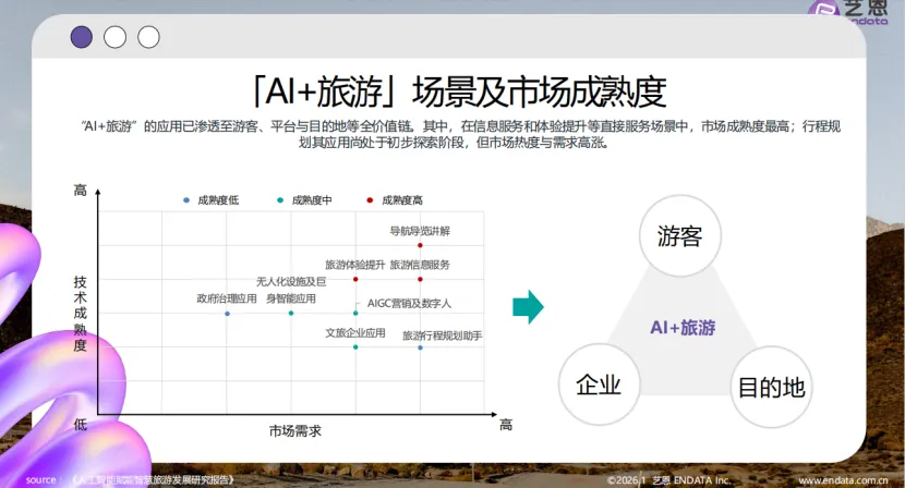 艺恩发布的《2026智旅新纪元:AI与旅游产业融合全景报告》显示,人工智能技术的突破性落地与深化应用已成为推动中国智慧旅游市场持续增长的核心引擎,旅游业正加速迈入智能化、个性化与高效化的全新发展阶段。 报告指出,AI对智慧旅游的赋能主要依托两大核心支柱:一是AI技术的底层突破性进展,大模型能力的平民化普及、云原生架构的成熟与算力成本的持续下降,显著降低了行业应用门槛并提升了运行效率;二是以DeepSeek等平台为核心构建的开放联动型产业生态,从底层算力资源到通用开源大模型,从应用智能体到行业解决方案,已形成完整的AI产业协同体系,全面激活了国内大模型在旅游领域的落地应用。与此同时,AI向各行各业深度渗透的业务重构趋势,正推动旅游产业将核心业务与人工智能紧密结合,加速整体转型进程。AI+旅游的技术体系遵循清晰的三层架构:底层为算力与基础模型平台,提供核心动力支撑;中层是AI能力与业务中台,实现服务与流程协同;前端则是面向C端游客、B端企业及G端景区的场景化应用,三大层级共同驱动旅游业全面升级。