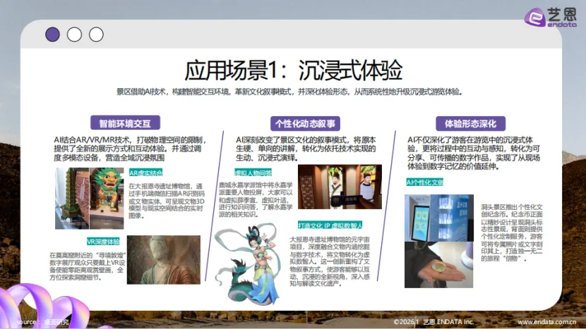 供给侧的目的地管理智能化进程也在加速推进,但整体仍处于初级阶段。数据显示,受访景区中50%尚未接入AI大模型,41.7%准备接入,仅8.3%已实现接入。景区大模型的应用主要集中在三大场景:面向游客的信息服务与体验升级、面向景区的智慧运营与调度、面向文化遗产的数字化保护与传播。 在信息服务与沉浸式体验方面,AI技术实现了景区信息的高度集成与智能化呈现,原本分散的门票政策、实时动态、交通指引等多源信息被统一整合至智能服务平台,游客可通过自然对话或一站式界面高效获取所需信息。庐山“一机游庐山”平台整合AI客服、实时天气卡片、动态云海概率显示等功能,黄山AI旅行助手提供智能导览与实时服务推荐,彻底改变了传统“单向推送”的信息传递模式。沉浸式体验方面,AI结合AR/VR/MR技术打破物理空间限制,大报恩寺遗址博物馆通过AR识别呈现文物3D模型,“寻境敦煌”数字展厅借助VR设备让观众零距离观赏壁画;鹿城永嘉学派馆实现虚拟人物问答互动,洞头景区推出可定制照片或文字的个性化文创纪念币,大报恩寺遗址博物馆的元宇宙项目更将文物转化为虚拟数智人,重构了文化叙事方式。