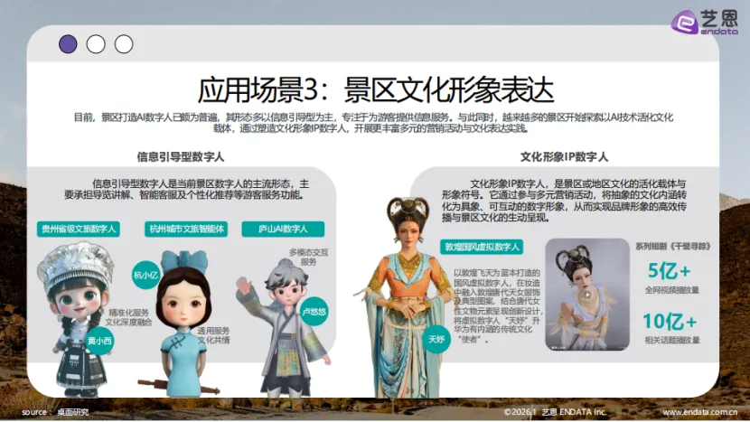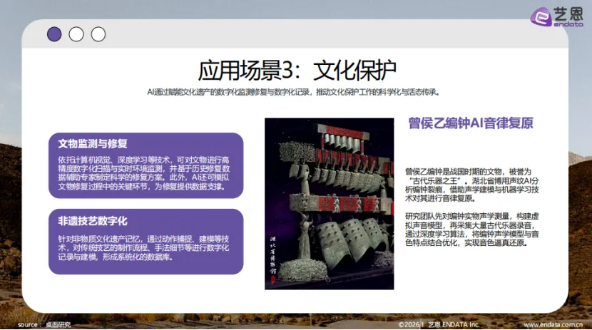 在文化保护与传播方面,AI技术正推动文化遗产的科学化保护与活态传承。景区打造AI数字人已成为普遍趋势,既有承担导览讲解、智能客服功能的信息引导型数字人,如庐山AI数字人“卢悠悠”、贵州省级文旅数字人“黄小西”,也有以敦煌飞天为蓝本打造的文化形象IP数字人“天妤”,其相关系列短剧《千壁寻踪》全网视频播放量超5亿,相关话题播放量突破10亿,成为传统文化传播的重要载体。文物保护方面,湖北省博物馆利用声纹AI分析曾侯乙编钟裂痕,借助声学建模与机器学习技术实现音律复原;AI还可通过高精度数字化扫描、实时环境监测,辅助专家制定科学的文物修复方案,并对非遗技艺的制作流程、手法细节进行数字化记录与建模,形成系统化数据库,推动文化遗产的长久传承。