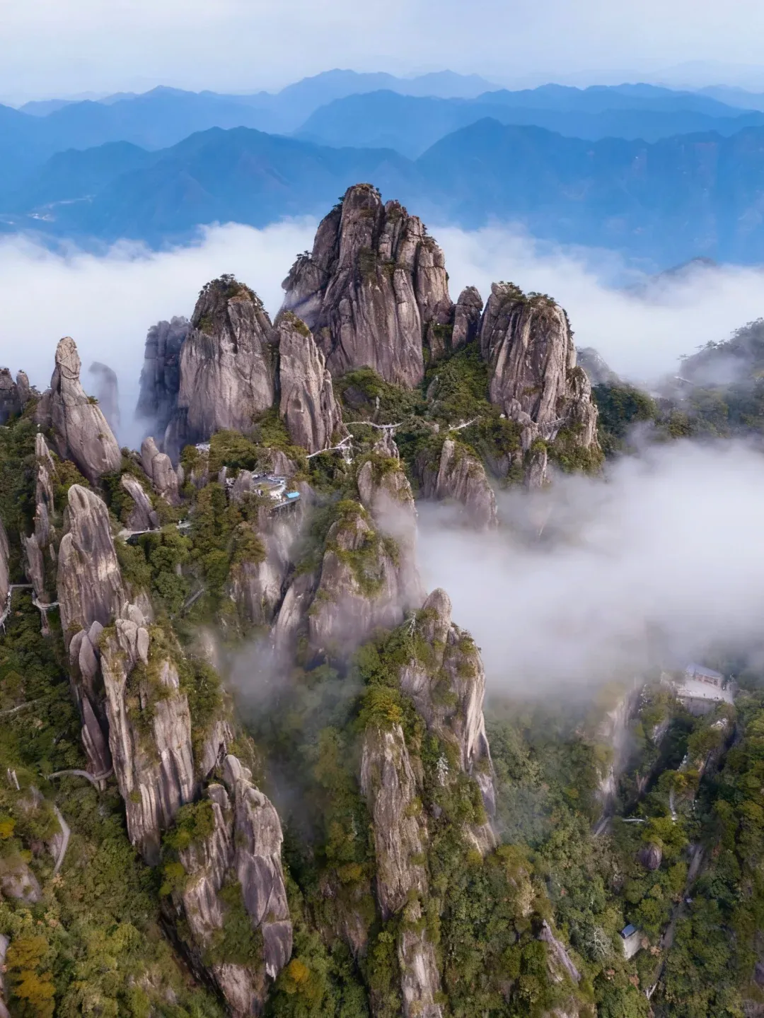 花岗岩峰林耸立云间,道教文化与自然奇观交融。