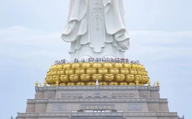 108米的海上三面观音 , 脚踩108瓣莲花 , 站海边远远一看 , 真的很震撼。