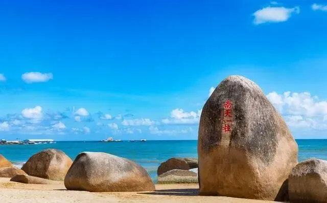天涯石立在沙滩上 , 海角石得走进海里才能看到 , 水清得能见底。