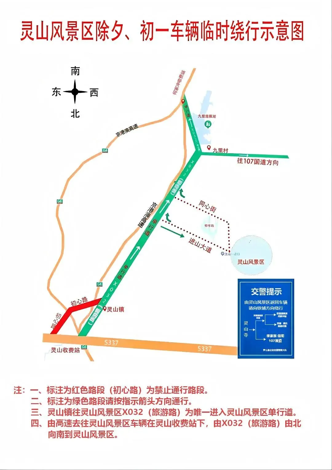 免费开放期间,游客集中出行可能会导致交通拥堵,拥堵路段主要集中在灵山镇至灵山风景区的县乡道路上。为解决交通拥堵问题,交管部门将临时采取交通管制,实行单向通行措施。届时,由灵山风景区返回的车辆将沿X032线向南绕行(如下图所示):