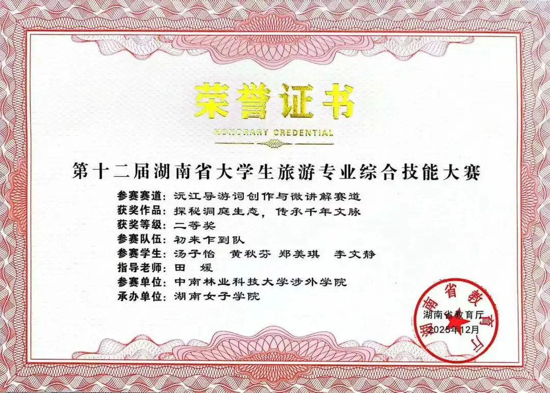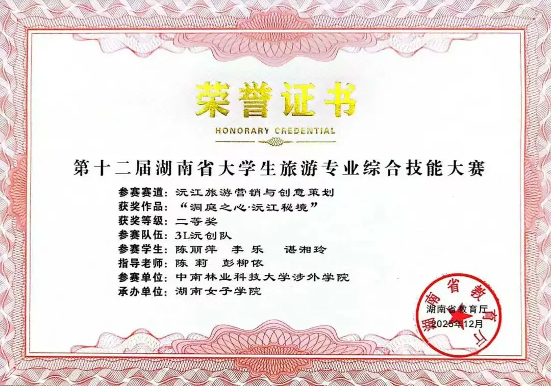 近日,由湖南省教育厅、湖南省旅游学会旅游教育专业委员会等多方举办的第十二届湖南省大学生旅游专业综合技能大赛传来喜讯。湖南省大学生旅游专业综合技能大赛是我省旅游类专业具有广泛影响力的学科竞赛,旨在深化旅游教育教学改革,推动产学研融合,提升学生调研分析、策划设计与团队协作的综合能力。