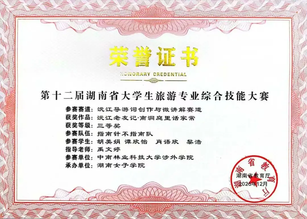 指南针不指南队(24级旅游管理胡美娟、谭欣怡、肖语欣、黎浩;指导老师禹文婷)携作品《沅江老友记·南洞庭里话家常》荣获沅江解说词创作与微讲解赛道省级三等奖。