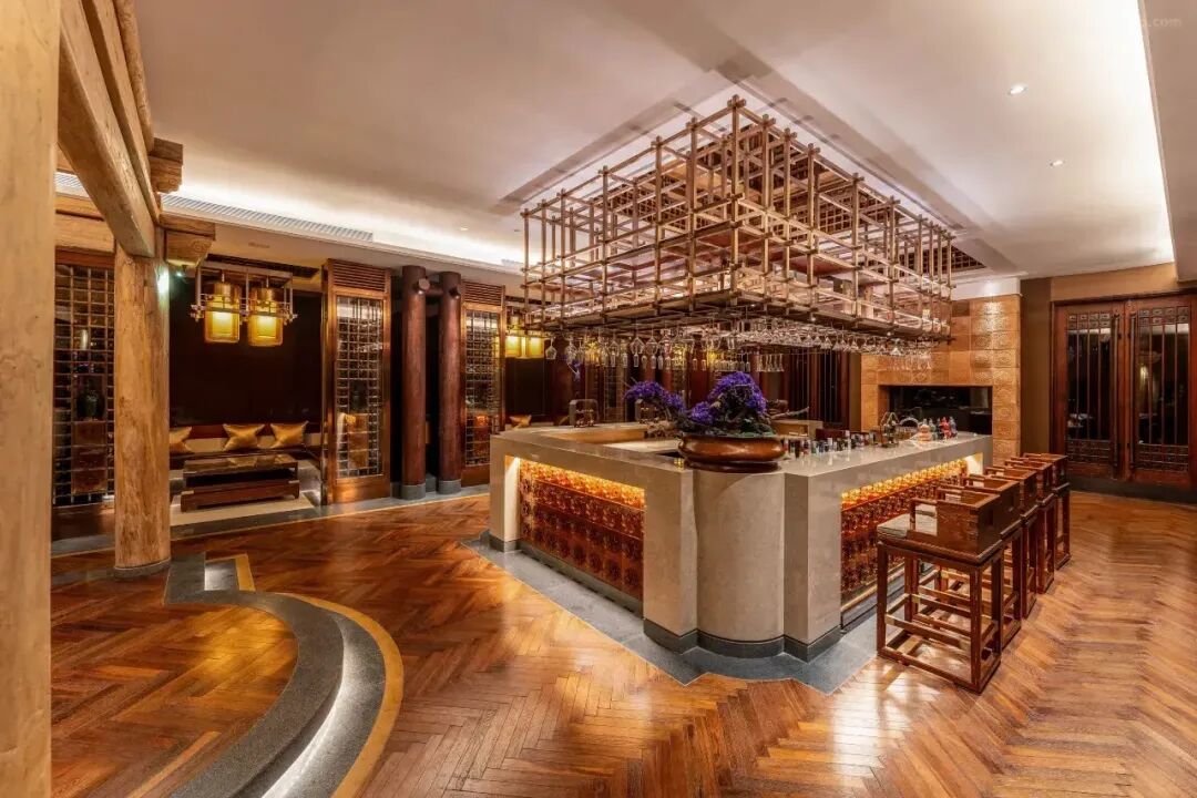 除了温泉之外,酒店内还拥有一间极具设计感的酒吧。天花板上悬挂着大型浅木色艺术装置,下方垂挂着成排高脚杯,在营造典雅氛围的同时也兼具了实用性。