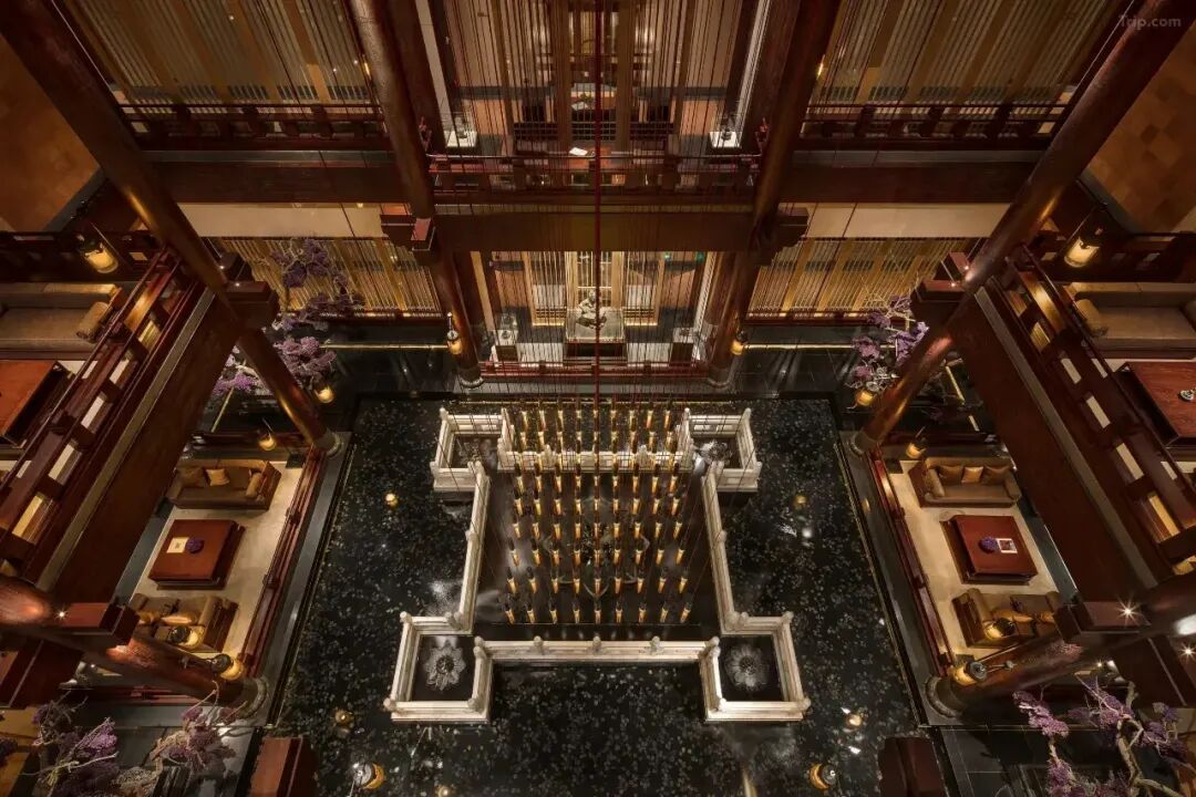 等待工作人员的期间可以落座到“唐吧”品一杯茶,“唐吧”是一处将唐代宫廷美学与现代奢华像融合的美学空间。正中央散发着典雅气质的莲花台成为了视觉焦点,池中密集排列着上百根金色莲花造型灯柱,暖黄灯光从柱体透出,宛如一片在夜色中盛放的金色莲池。