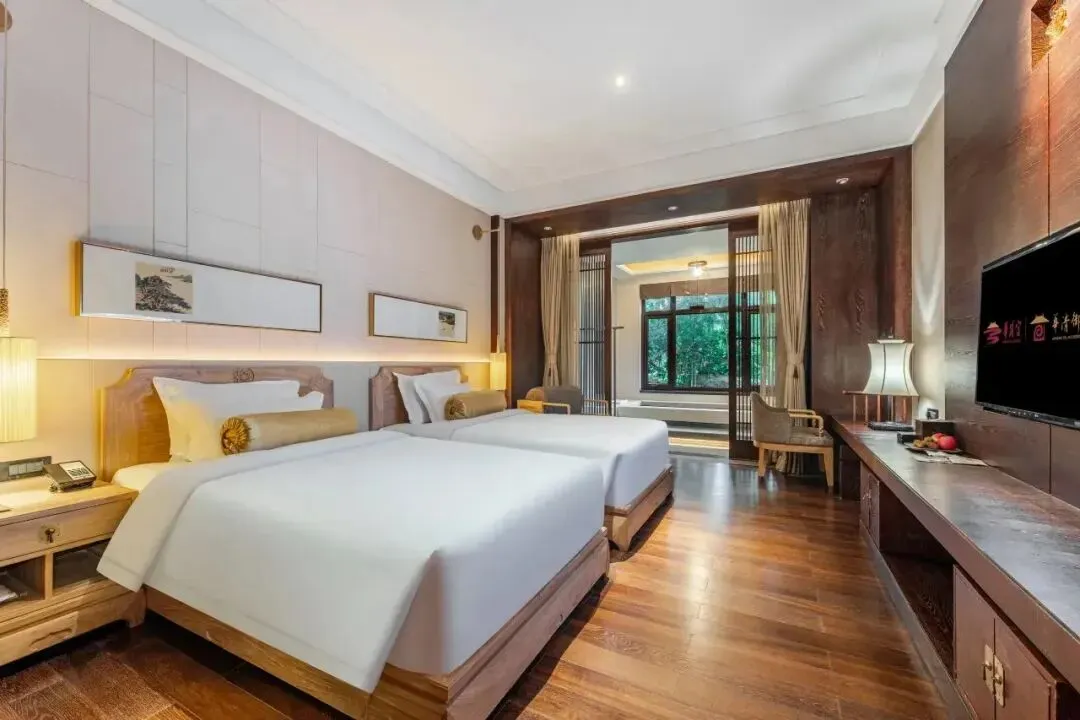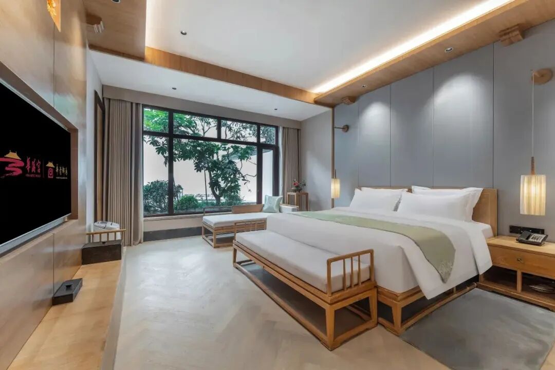 房间内复古的莲花纹随处可见,细节之处尽显唐风古韵。部分客房还设有木质的屏风,既能起到分隔空间的作用,又为整个空间增添了几分雅致。