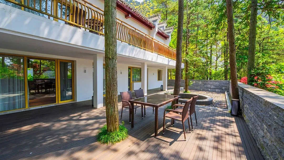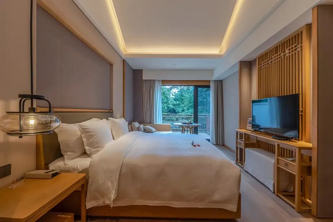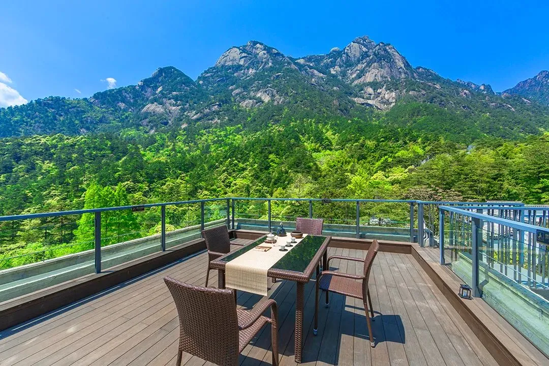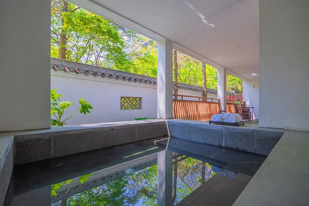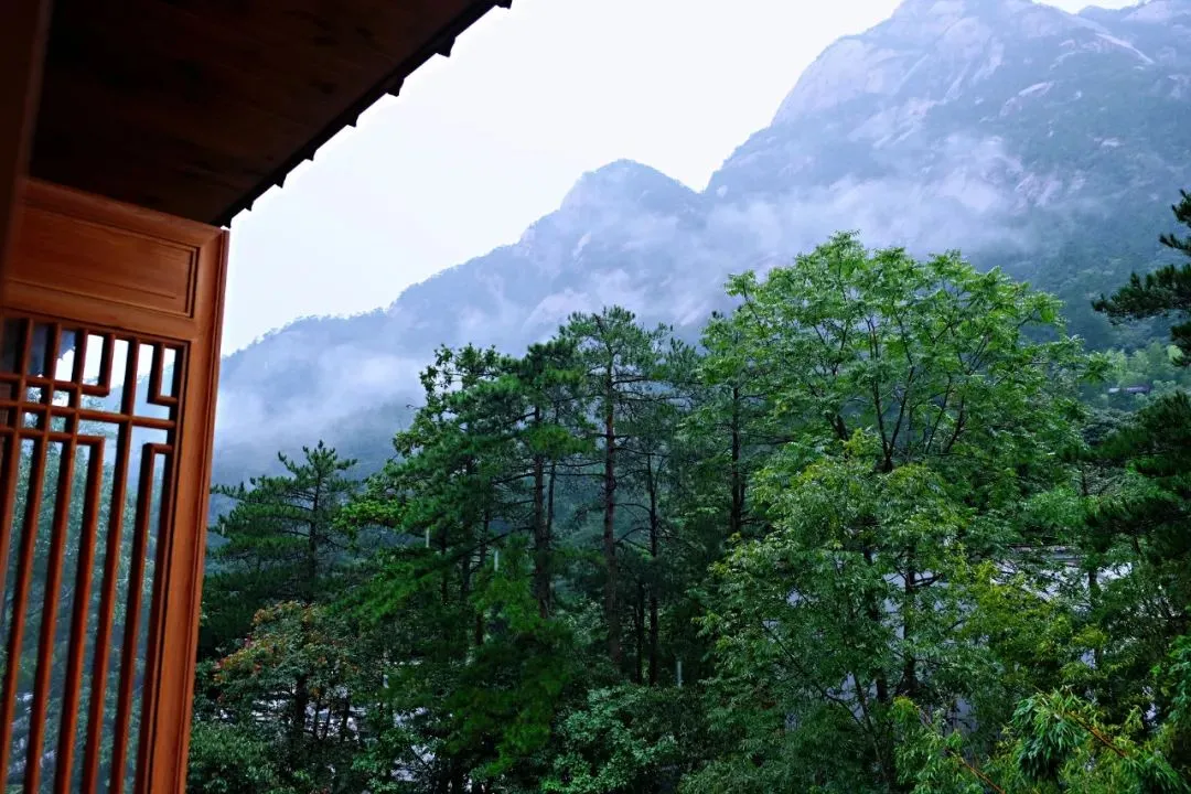 酒店四周更是群山、云雾围绕,风景清奇秀丽,自然底蕴浓厚。四时美景,观山望月,赏花听雨,住进来人也成了自然的一部分。