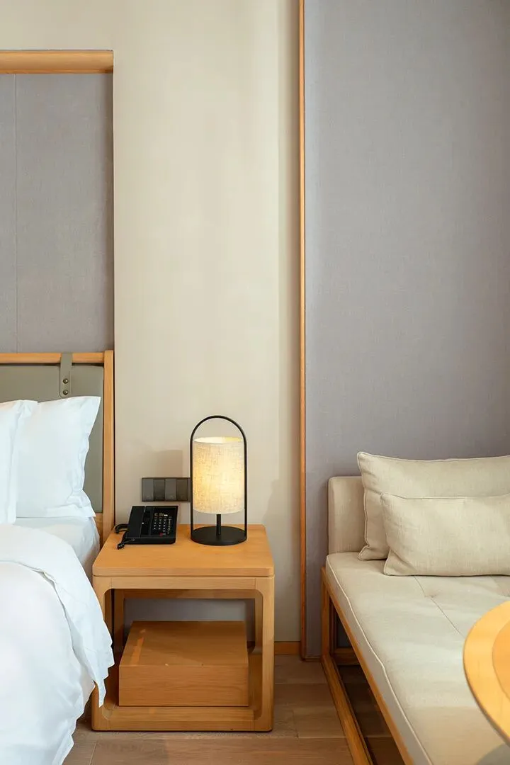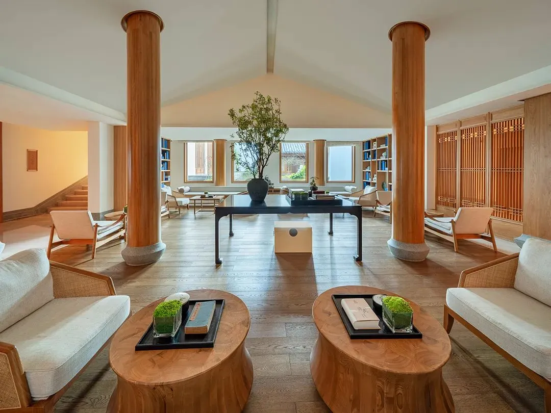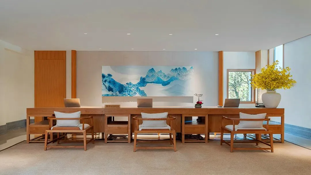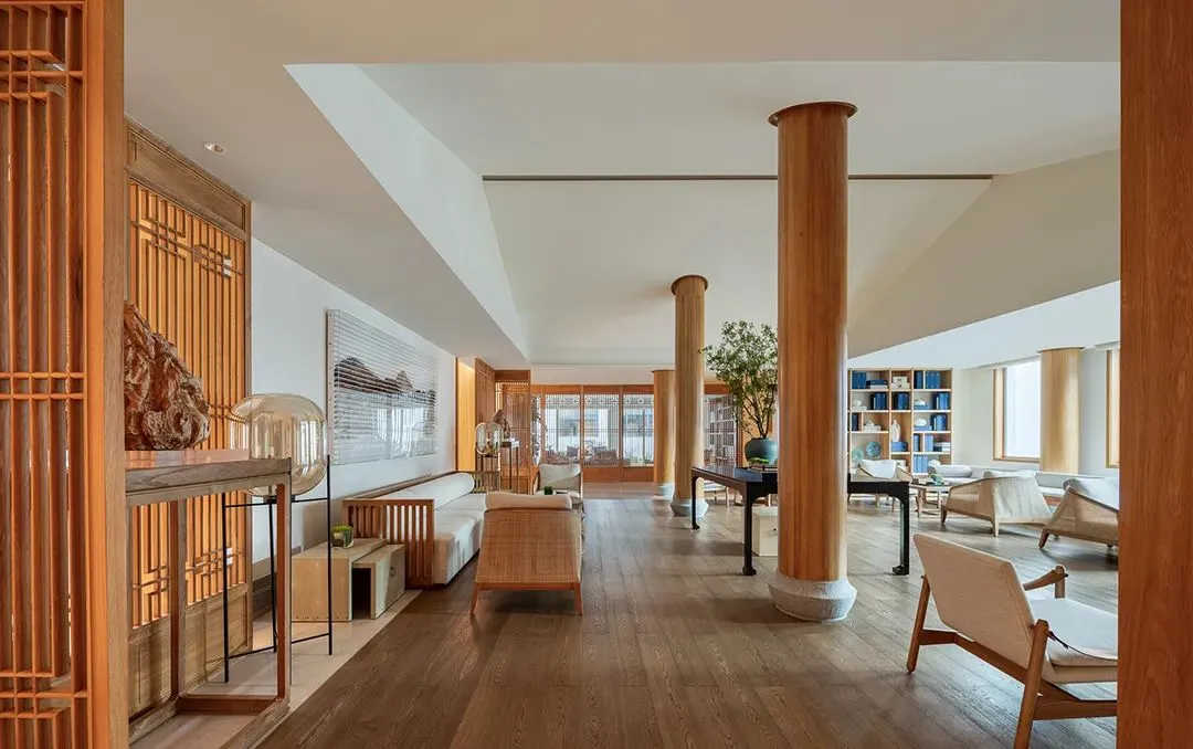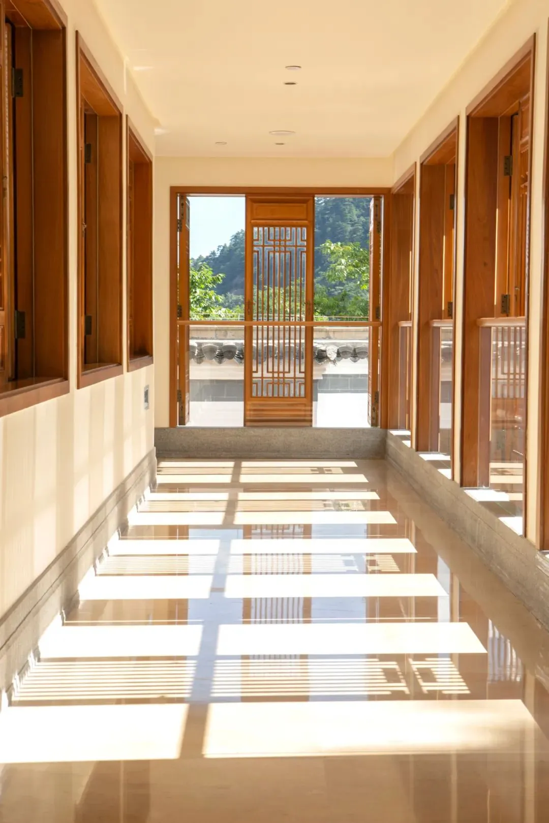 走入酒店中,随处可见木质材料。门、窗、屋顶的梁柱,以及古典幽静的酒店大门、中式大堂,再现了古时的闲情雅致。