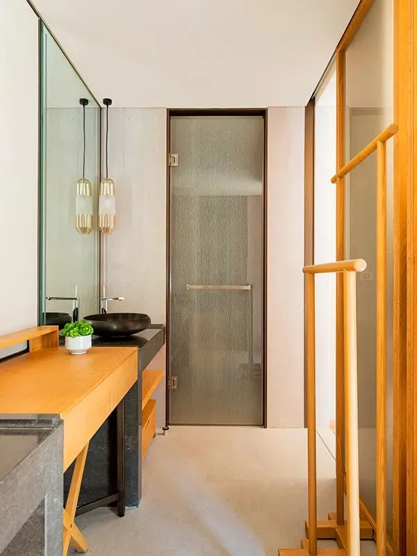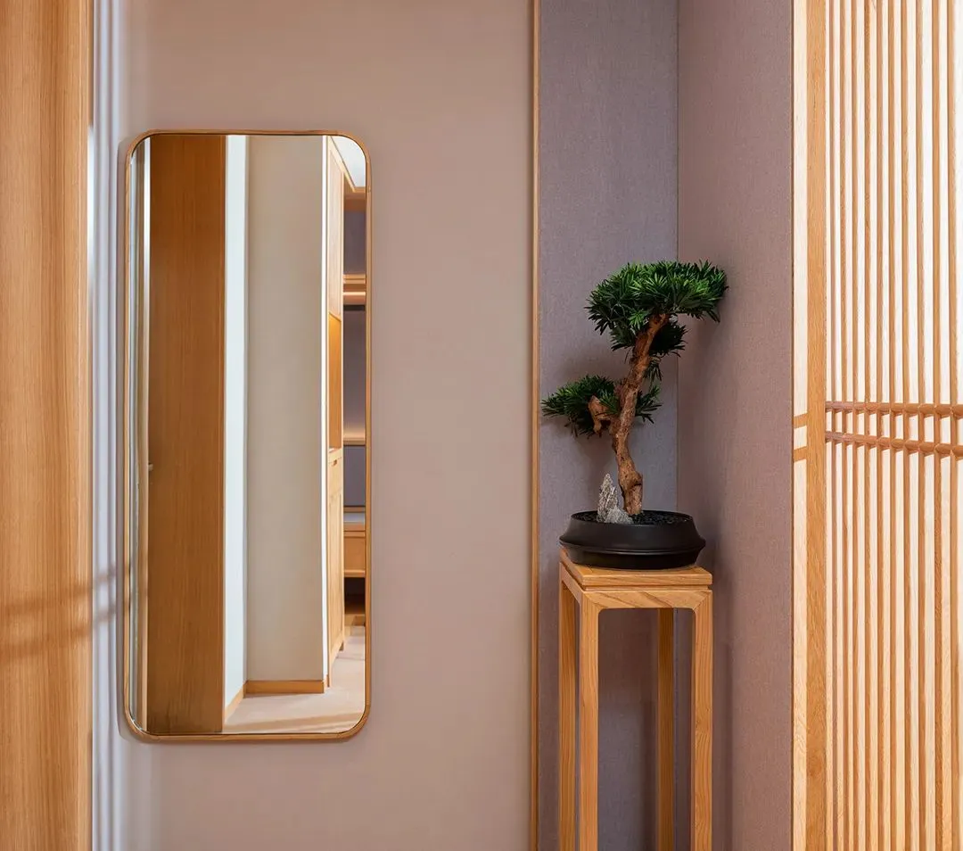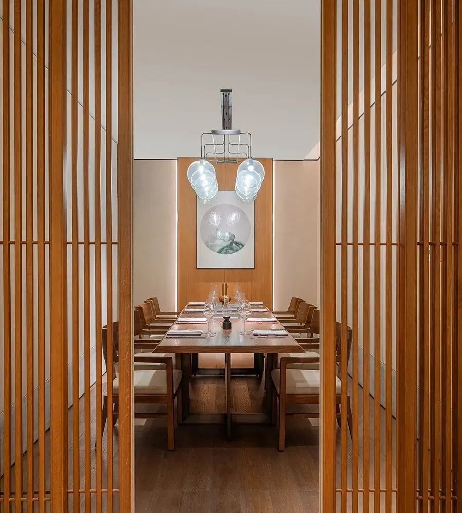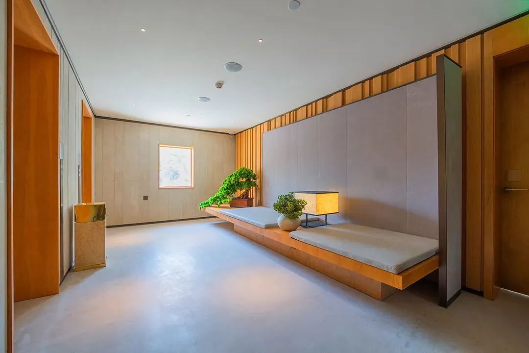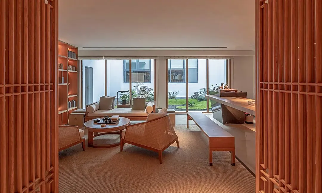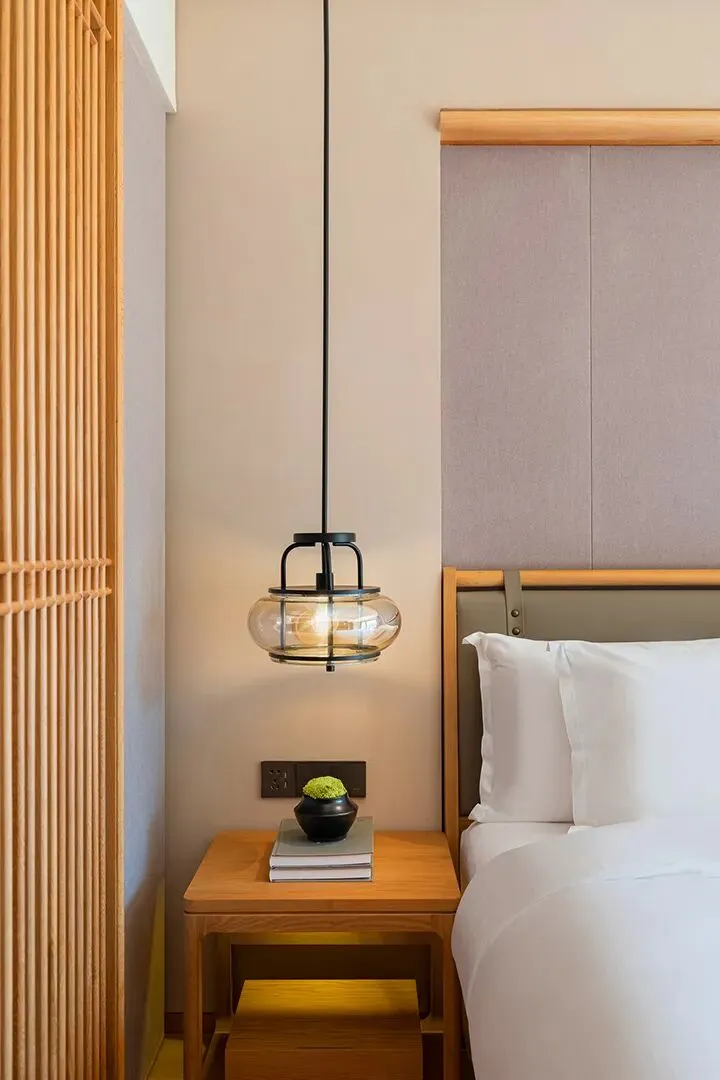 走入酒店中,随处可见木质材料。门、窗、屋顶的梁柱,以及古典幽静的酒店大门、中式大堂,再现了古时的闲情雅致。