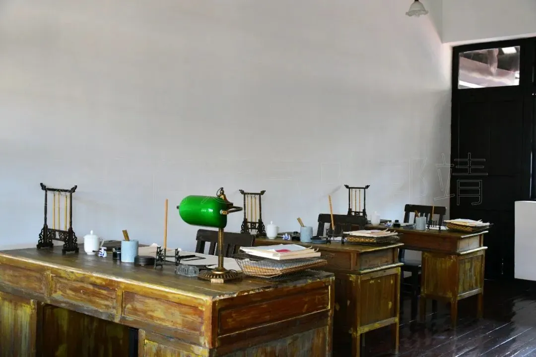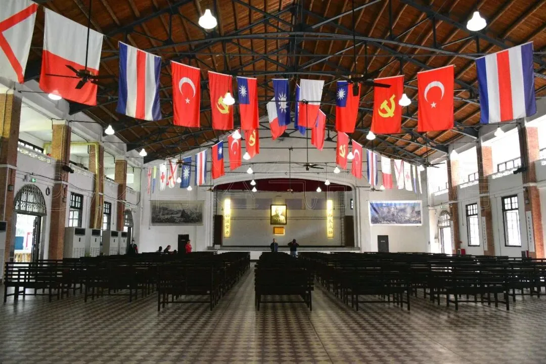 穿过绿油油的草坪,推门进去,里面摆着一排排长椅,前面是个小舞台,墙上挂着不少中山先生的照片,都是当年师生们在这里开会、演出的场景。