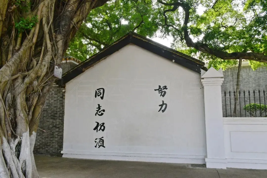 正门旁边的一堵白色墙上面用黑色大字写着“同志仍须努力”,字又大又清晰,老远就能瞧见。