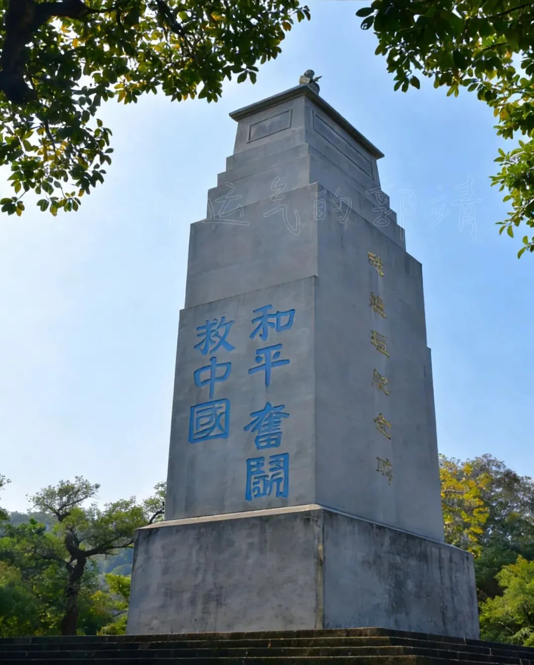 纪念碑有三十多米高,碑身是灰色水泥做的,上面刻着“和平、奋斗、救中国”几个蓝色大字,特别醒目。