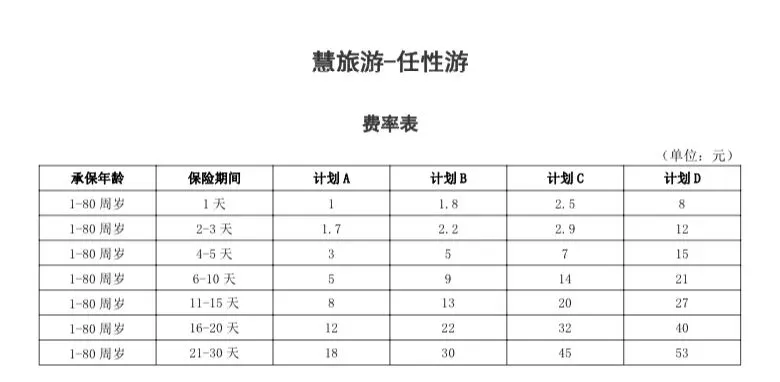 一、投保规则 1天-80岁都可以投保,61-80岁涉及“意外身故、残疾保障”、“公共交通工具意外保障”、“急性病身故保障”、“自驾车意外身故、残疾“保险金额为上表所载金额的一半,保险费维持不变。 承保中国大陆地区、香港、澳门地区发生的意外伤害事故(不含台湾),保障时间可选1-30天。 支持当天投保生效(当天投保最晚不超过18:00),投保支付成功2小时后生效,保险期限截止当日24时。 二、保障责任 1、身故伤残保障: 慧旅游–任性游有4个计划,意外身故伤残最高保额50万,突发急性病身故(含猝死)最高1万。 其中,伤残需达到《人身保险残疾评定标准(行业标准)》所列的残疾程度之一,伤残赔付比例参见下表: 意外及急性病医疗额度(共享)最高4万,境内游医保内0免赔100%赔付,其中拓展自费药和自费诊疗部分,限额3000元。 港澳游意外医疗及急性病医疗每次事故免赔200元后按照90%赔付。 慧旅游–任性游的医疗责任拓展自费药和诊疗费用,比起很多旅游险要优秀,而且没有免赔额,报销比例100%。 3、意外住院津贴: 旅行期间,意外伤害需要住院治疗的,每天50元住院津贴,30天为限。 4、公共场合个人责任: 保险期间内,公共场所内因其疏忽或过失致使第三者遭受人身伤害或财产损失,依事故发生地法律规定应由被保险人承担的经济赔偿责任,保险公司根据本保险合同的约定负责赔偿。 5、价格划算: 最低1元/天,不同计划提供不同保额,可按需选购。