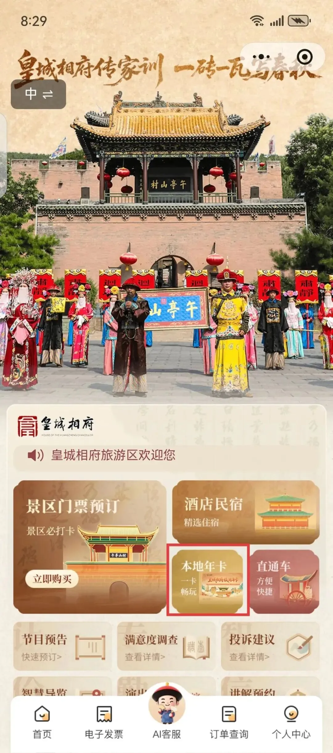 找到【本地年卡 / 皇城相府旅游年卡】入口;
