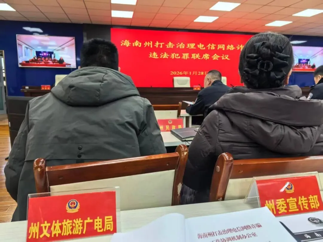 1月28日(星期三),海南州文体旅游广电局分管负责同志参加《海南州打击治理电信网络诈骗违法犯罪联席》会议