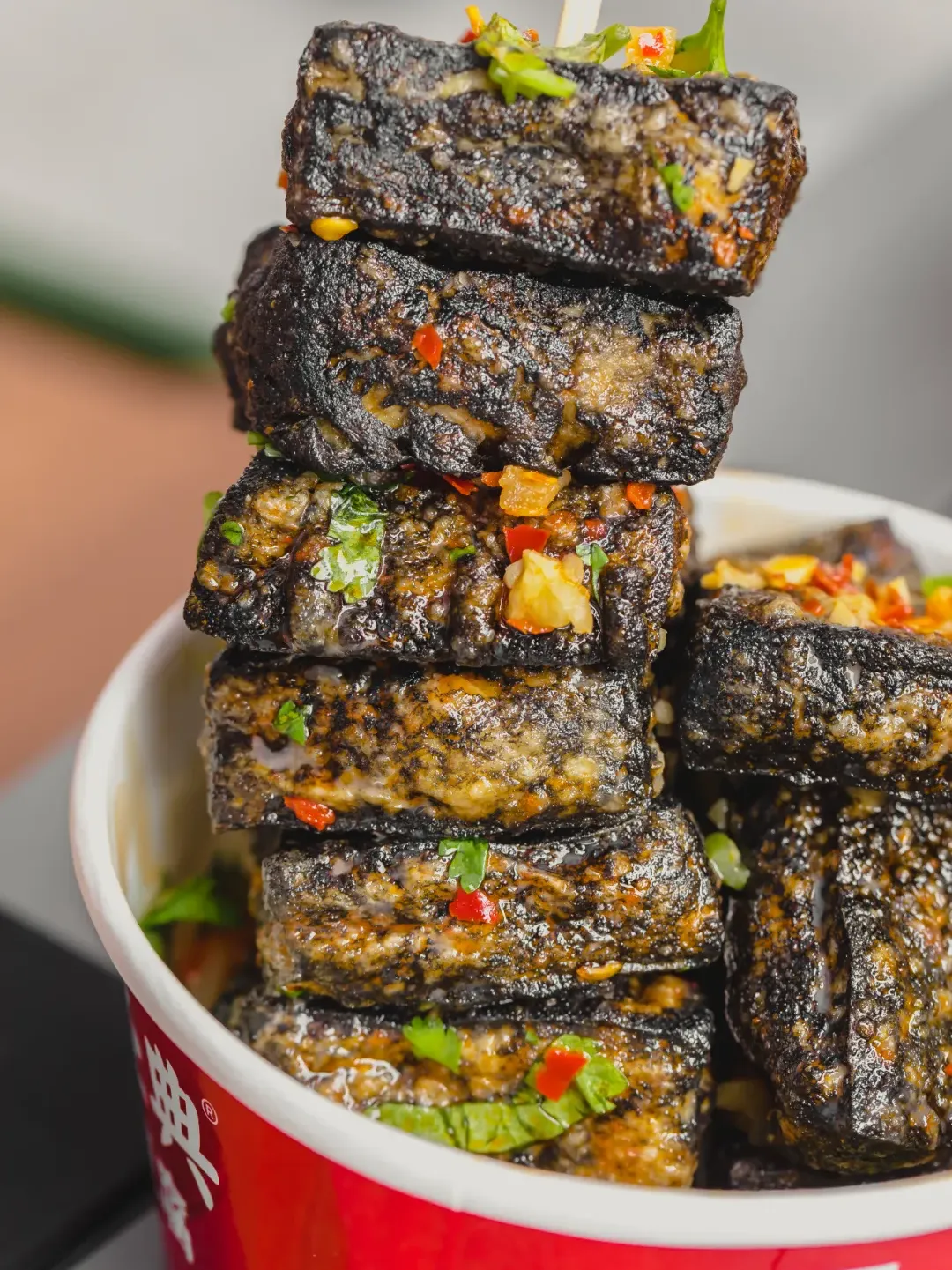 黑色经典是让你一口就爱上的长沙“爆汁”臭豆腐!现炸的豆腐外壳焦香酥脆,浇上秘制的蒜蓉辣汁,一口咬下去,汤汁在嘴里瞬间“爆炸”,外酥里嫩,香辣可口,是吃过就忘不掉的长沙味道。