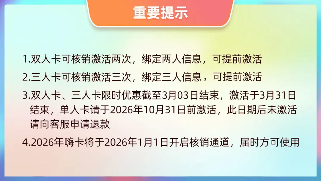 我买了一张双人卡/三人卡,为什么只有一个激活码:单人卡是8位数的激活码激活一次,绑定一个人;双人卡是同一个8位数的激活码可激活两次,可绑定两个人;三人卡是同一个8位数的激活码可激活三次,可绑定三个人。